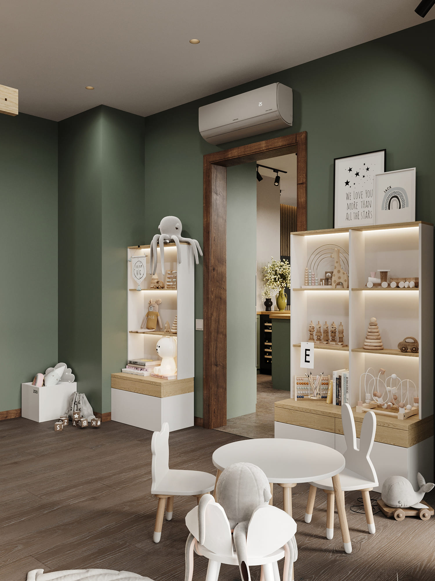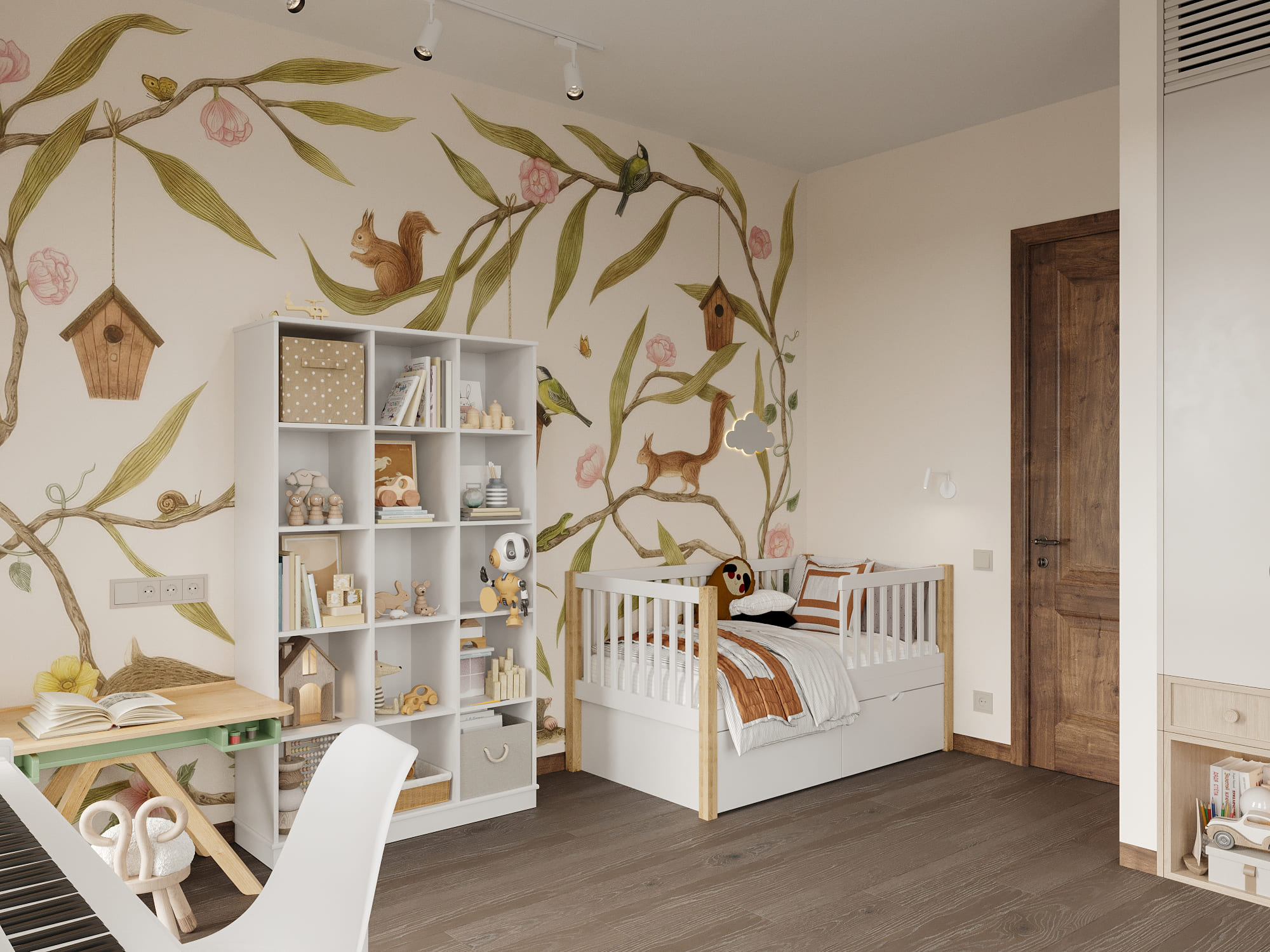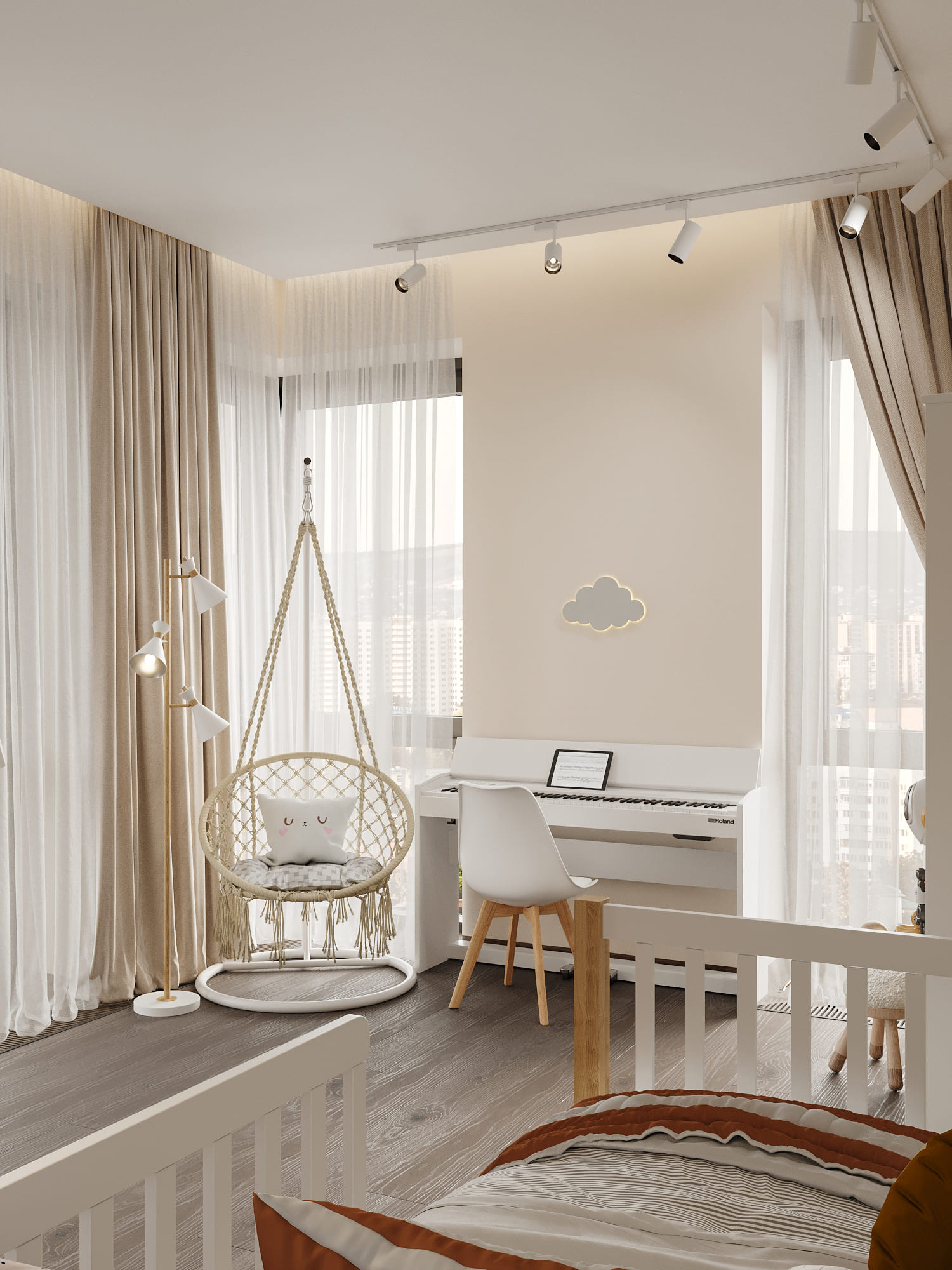 Первая комната - светлое и воздушное пространство, которое мы создали для маленькой принцессы. Основой атмосферы стали нежные стены с ручной росписью — милые белочки и птички на ветке, что создает ощущение сказочного леса и пробуждает фантазию. Центром хранения является эргономичный трехстворчатый шкаф, который легко справляется с гардеробом и игрушками, сохраняя порядок. Для творческих занятий мы разместили компактный столик со стульчиком, где можно рисовать и лепить, а также детское пианино для первых музыкальных опытов. Особенным акцентом стало подвесное кресло-качель у окна — любимый уголок для уединенного чтения и мечтаний. Вся мебель подобрана с закругленными углами и выполнена в светлых тонах, что делает пространство одновременно безопасным, функциональным и полным волшебства.