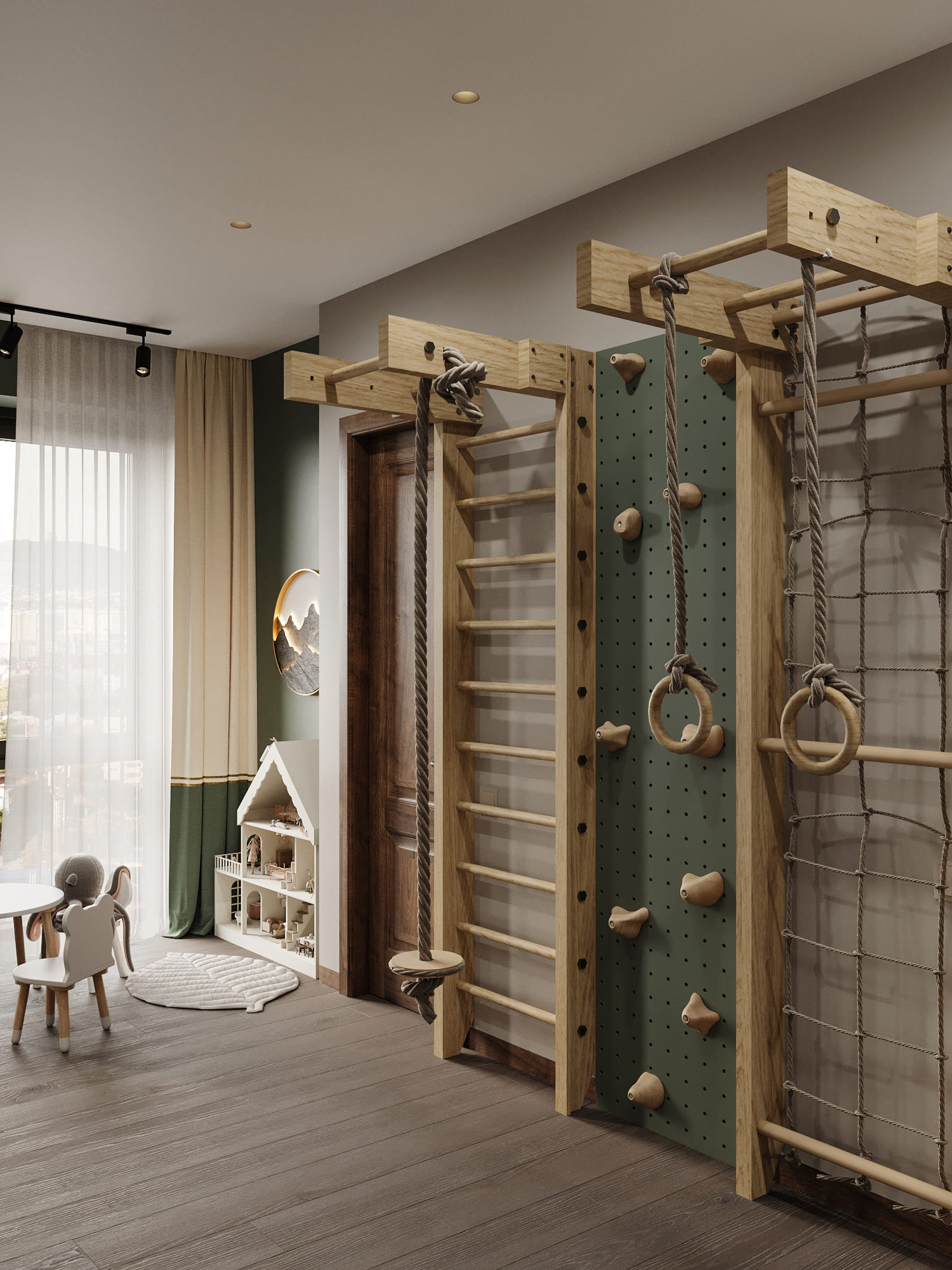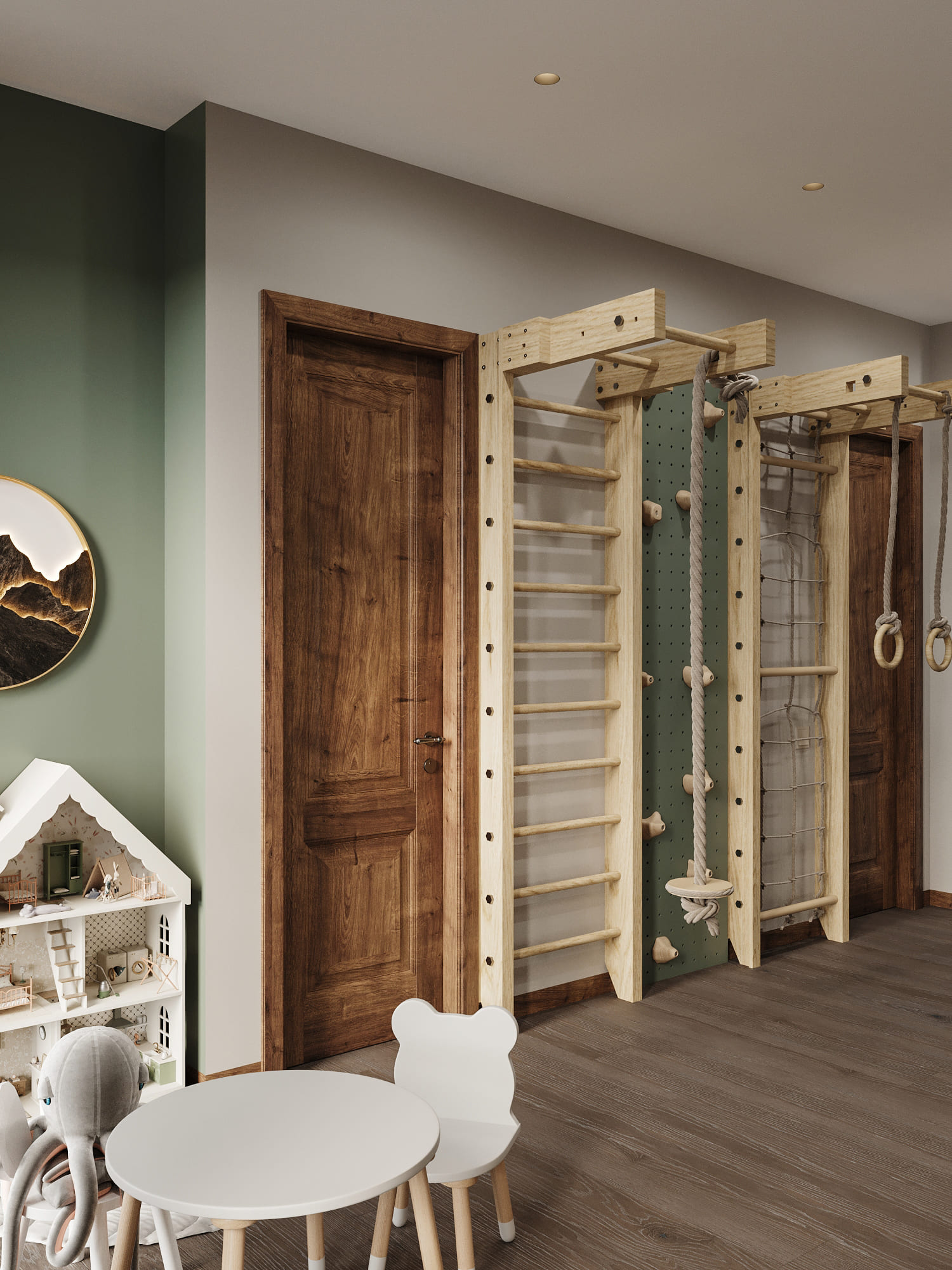 В игровой комнате, расположенной рядом с кухней-гостиной, разместили шведскую стенку и скалодром - ещё одно отдельное пожелание заказчиков. Дверной проём вместо обычной двери позволяет всегда контролировать активные детские игры. Из игровой можно попасть в каждую из детских комнат.