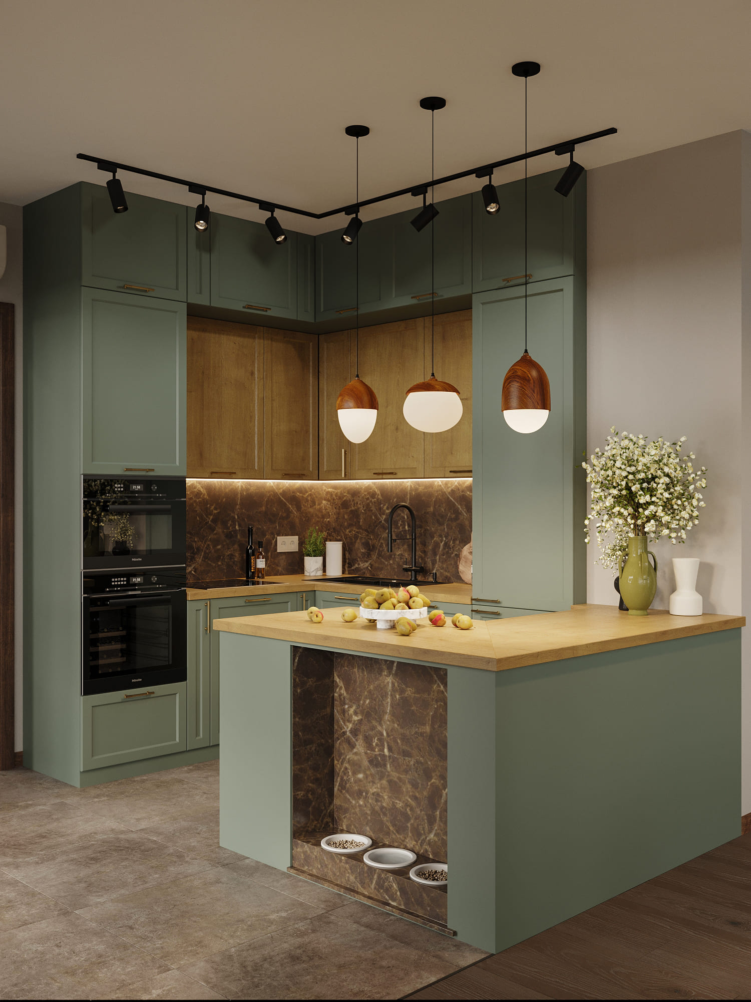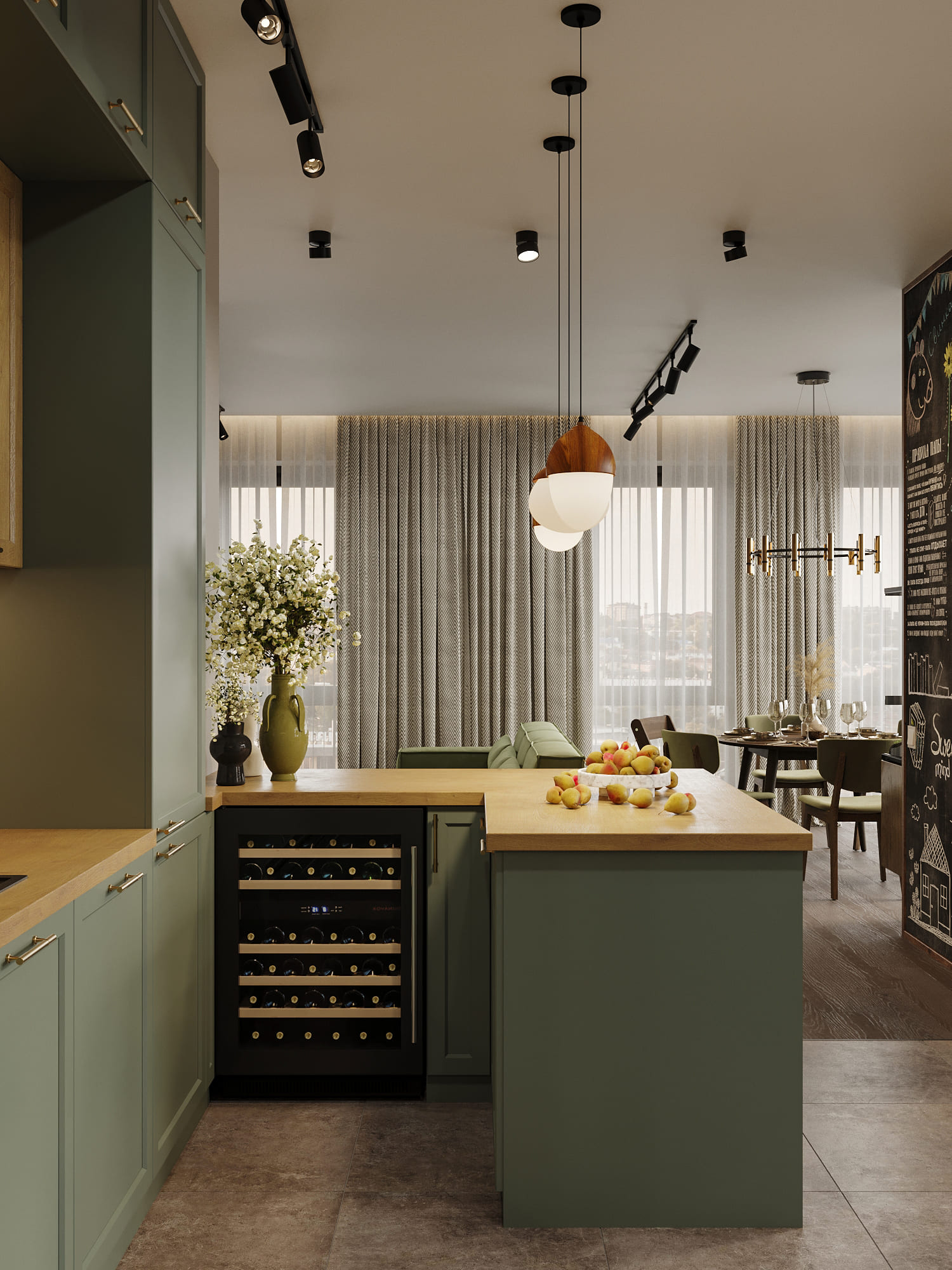 В кухонной зоне мы спроектировали эффектную угловую кухню в зеленых тонах, которая гармонично вписана в нишу, что создает ощущение порядка и цельности. Центром композиции стал Г-образный остров, объединяющий в себе зону для готовки, барную стойку и практичные системы хранения, включая секцию для вина. Элегантности добавляет фартук из мрамора, который прекрасно контрастирует с матовыми фасадами. Интересной деталью стали необычные формы светильников над островом. Кухня спроектирована до потолка, в ней есть вся необходимая техника и множество мест для хранения.