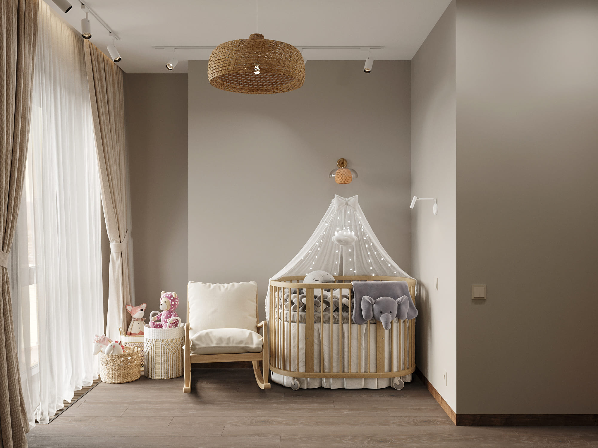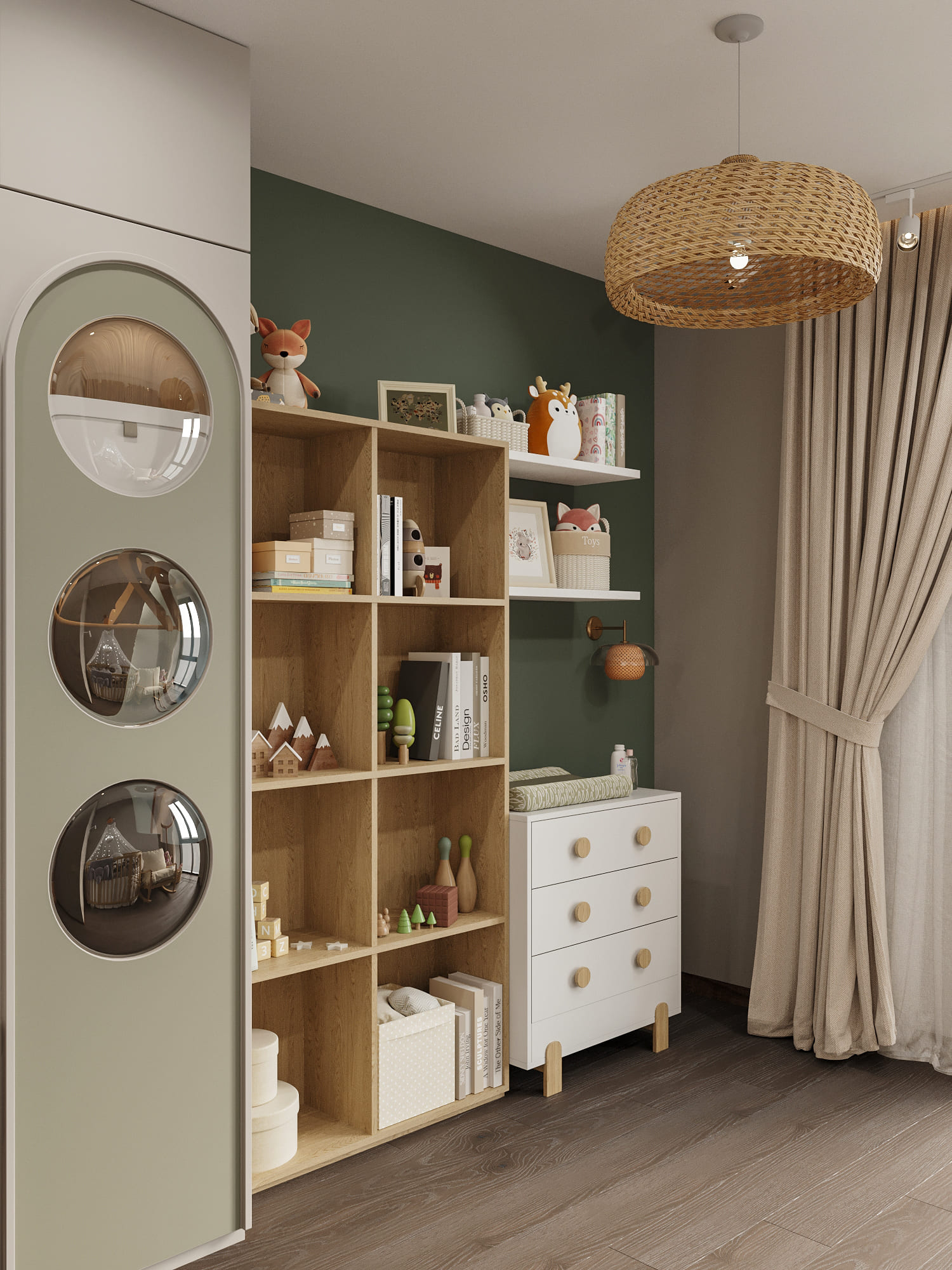 Вторую детскую комнату для новорожденного мы наполнили атмосферой нежности и спокойствия, где каждая деталь продумана для комфорта малыша и мамы. Центром пространства стала практичная кроватка-трансформер, которая будет расти вместе с ребёнком, а для самых трогательных моментов укачивания мы разместили уютное кресло-качалку рядом. Функциональную зону с пеленальным столиком дополнили открытым стеллажом, где всё необходимое — от книг до игрушек — всегда под рукой. Особое настроение интерьеру придаёт шкаф с дизайнерскими дверцами: три круглых, похожих на иллюминаторы, прозрачных вставки добавляют элемент игры и лёгкости. Всё это создаёт гармоничное и безопасное пространство, в котором так приятно начинать первые дни жизни.