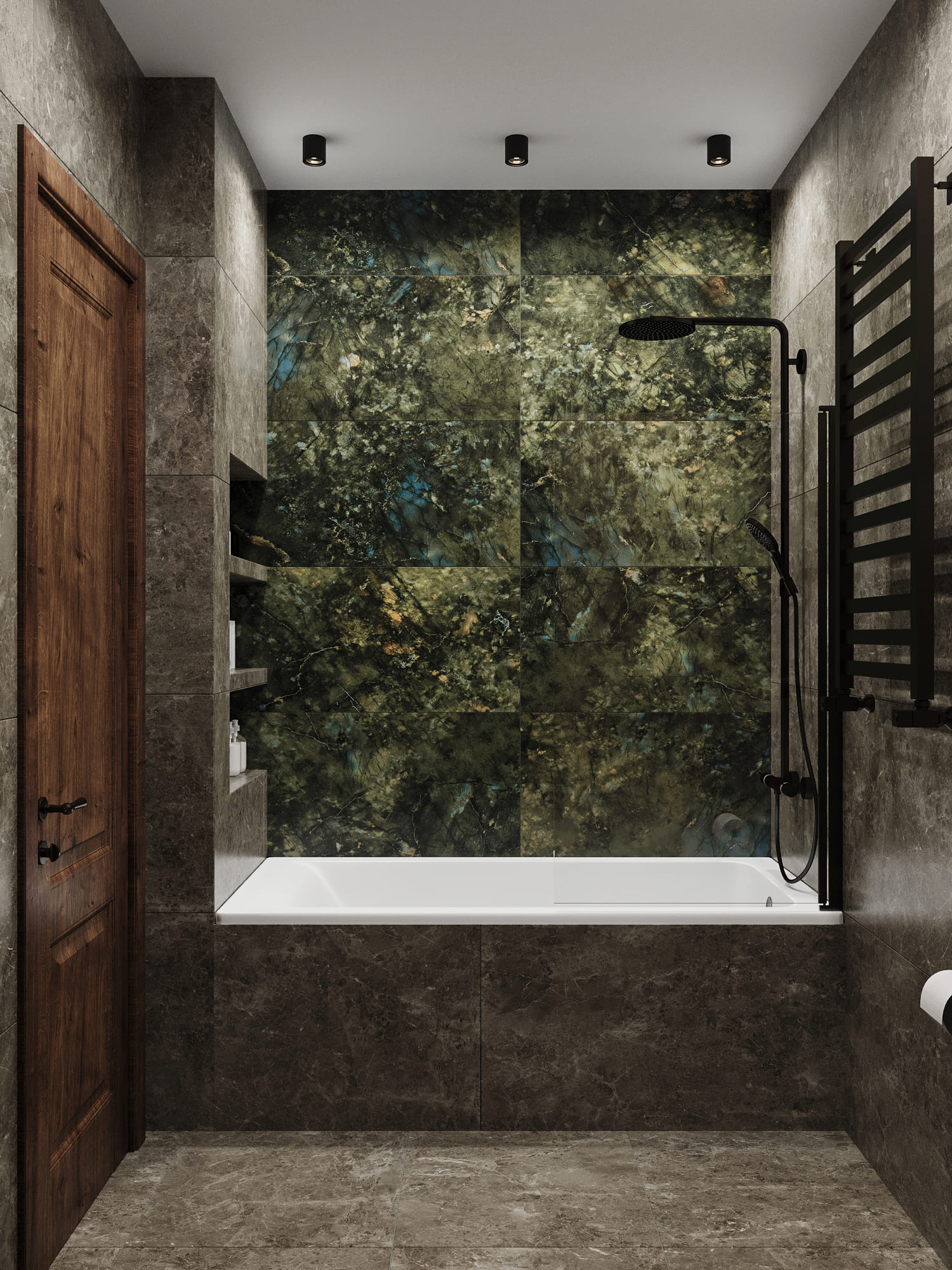 Во втором санузле имитацию скалы расположили в зоне умывальника - благодаря выбранной текстуре, цвету и подсветки она выглядит очень стильно. Здесь заказчики предпочли разместить ванную, и помимо множества полок закрытого хранения, для удобства в зоне ванной разместили открытые полки для декоративных средств. Этот санузел, благодаря брутальной имитации скалы и зеленой плитки необычного рисунка в зоне ванны, выглядит как некое сказочное пространство в мифической пещере, что продолжает общую концепцию стиля - обилие природных материалов и оттенков.