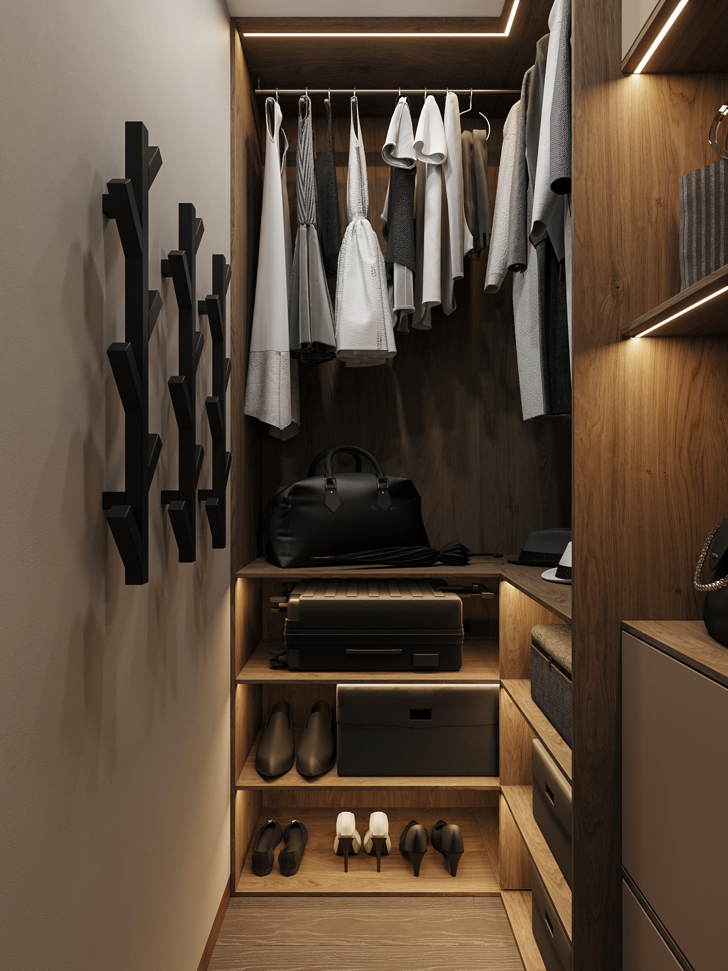 Из мастер-спальни мы попадаем в гардеробную комнату. Основная концепция этой гардеробной — безупречная эргономика. Мы создали две ключевые системы: глубокие полки для хранения обуви и аксессуаров и просторные секции с штангами для одежды на плечиках. Также предусмотрели закрытые ящики для хранения нижнего белья или сезонной одежды. Такое зонирование не только экономит время, но и бережно хранит вещи любого типа.