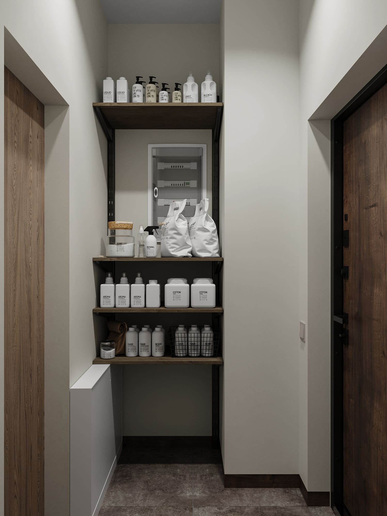 В кладовой комнате мы разместили многофункциональную стеллажную систему, позволяет систематизировать хранение всего — от запасов продуктов до средств для уборки. Особое внимание было уделено интеграции электрощитка: мы обеспечили к нему постоянный и беспрепятственный доступ, при этом визуально он сливается со стеллажами.