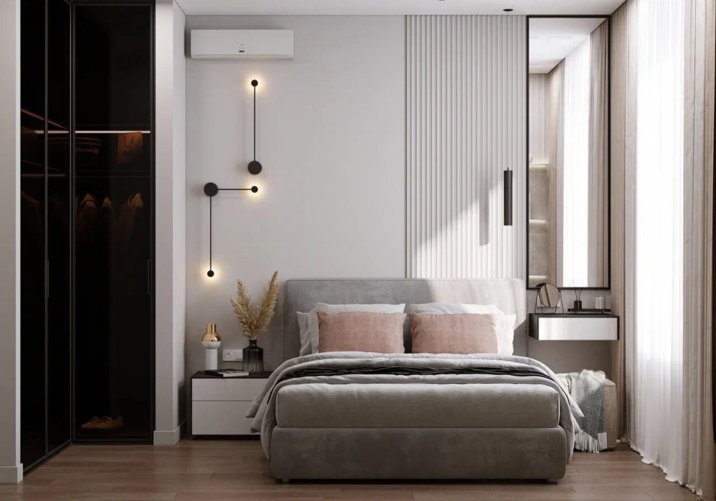 Спальня организована крайне минималистично и функционально ввиду небольшого размера. Она включает: лишь большую кровать; для экономии места только со стороны мужа - тумбу, а со стороны жены - мини бьюти-зону в виде компактной подвесной консоли-туалетного столика, большого зеркала до потолка, в которое удобно смотреться во время уходовых процедур и которое визуально расширяет пространство, удобного небольшого пуфа; ТВ панель.