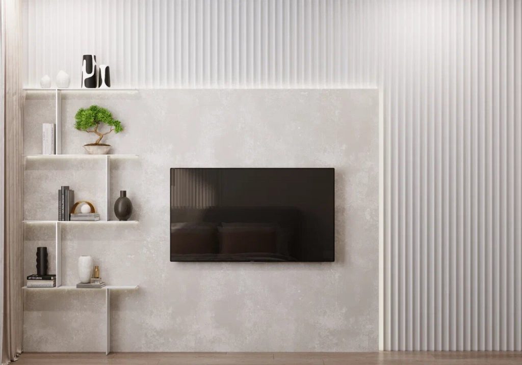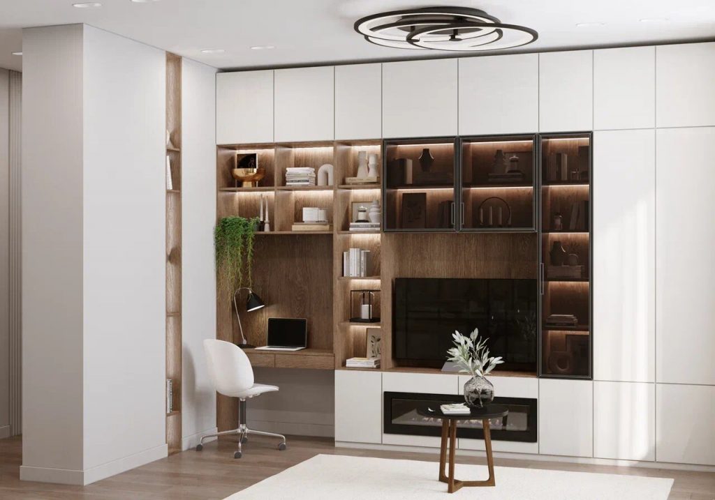 В гостиной имеется зона отдыха в виде большого углового дивана, минималистичного журнального круглого столика, ТВ панели с ТВ тумбой, в которую встроен искусственный камин. Также, здесь имеется небольшая рабочая зона с встроенным подвесным компьютерным столом и удобным компьютерным креслом. Размещена тут по пожеланию заказчиков и большая система хранения по пожеланию заказчиков в виде встроенных в нишу множества полочек, как со стеклянными дверцами, так и открытого типа.
