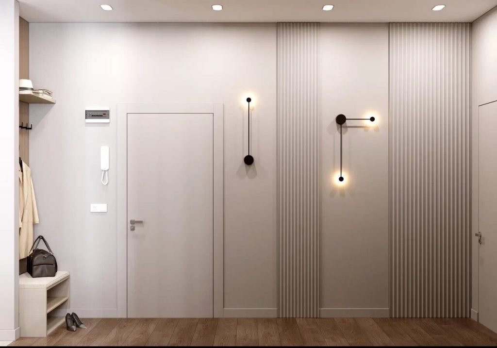 Дизайн-проект данной двухкомнатной квартиры разрабатывался для супружеской пары. Заказчики хотели получить лаконичный и функциональный современный интерьер с хорошо проработанными системами хранения, в том числе, и встроенного типа. Потому, прихожая исполнена крайне минималистично и эргономично. Она включает только встроенную в нишу вешалку-панель с крючками, верхнюю полку над ней для головных уборов и обувницу-сидение под ней. А в коридоре организован встроенный в нишу шкаф с фасадами с зеркалами, в которые можно посмотреться, выходя из дома. Уют прихожей придают минималистичные бра на стене около входной двери.