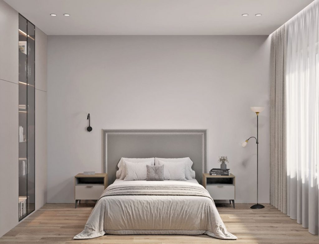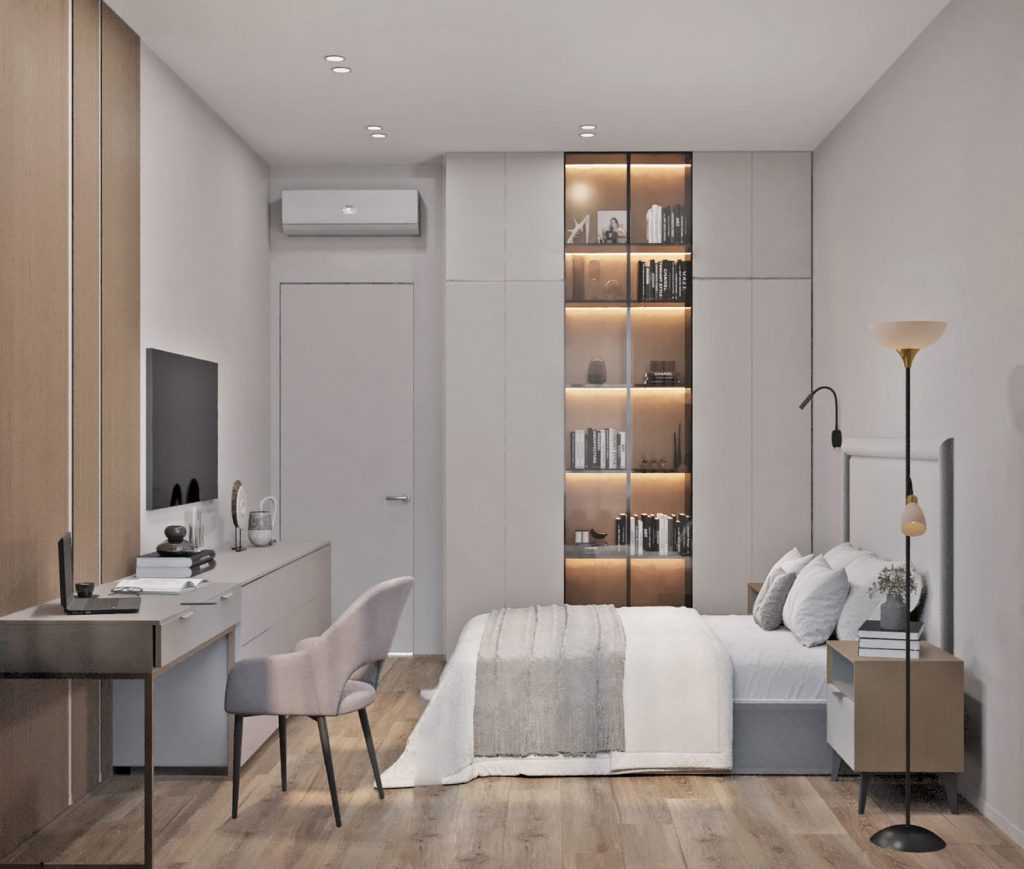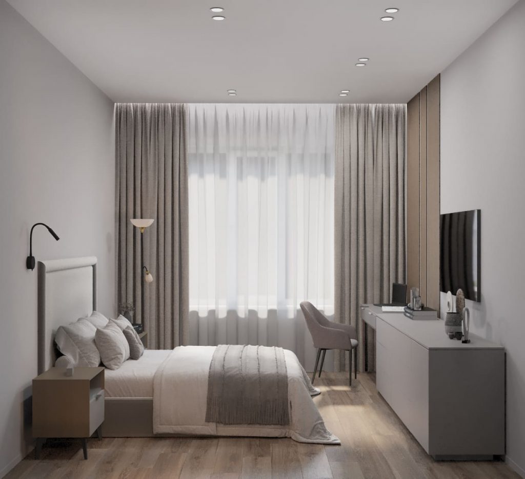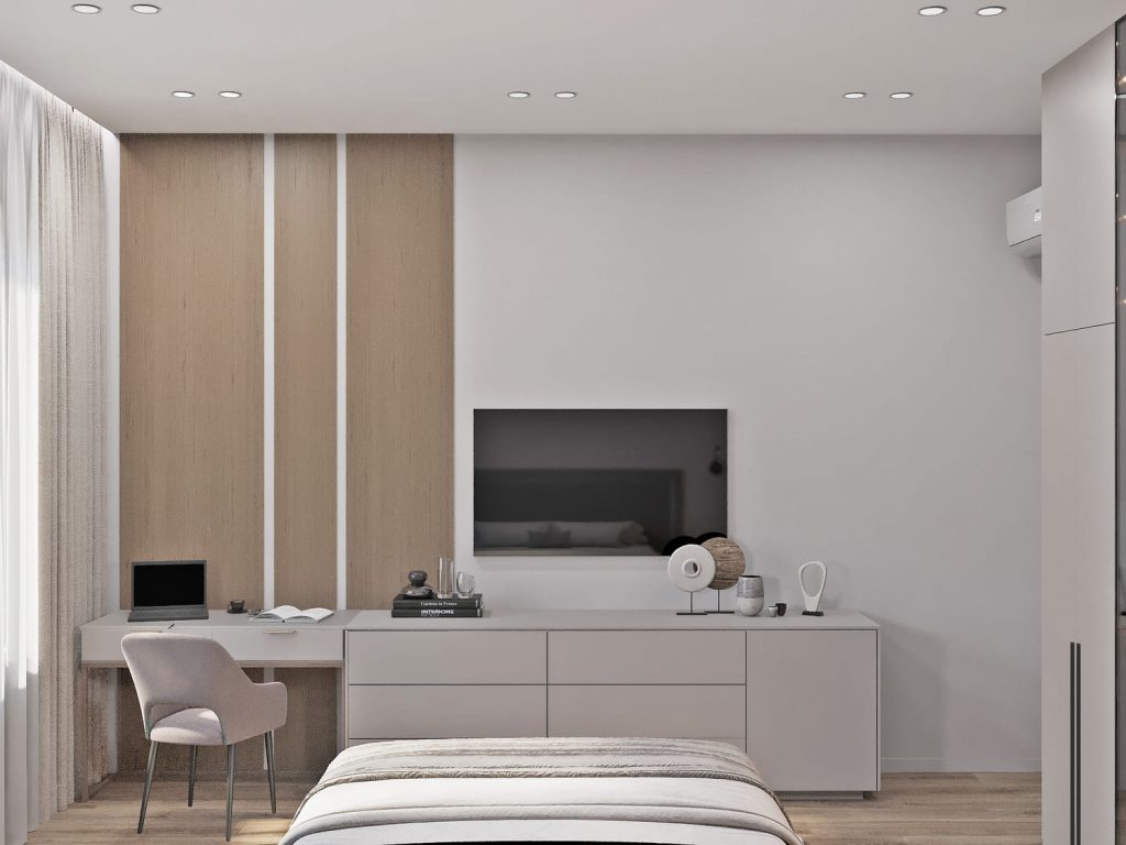 Основой композиции стала мягкая кровать с текстильным изголовьем, выполненная в спокойных серо-бежевых оттенках. С одной стороны комнаты расположен функциональный блок с рабочим местом: лаконичный стол, удобное кресло и телевизор. Стена за зоной ТВ оформлена тёплыми деревянными панелями, которые добавляют интерьеру уют и визуально «согревают» пространство. Отдельного внимания заслуживает шкаф с частично стеклянными фасадами и встроенной подсветкой. Пол — тёплое дерево, текстиль — натуральные материалы в светлой гамме.