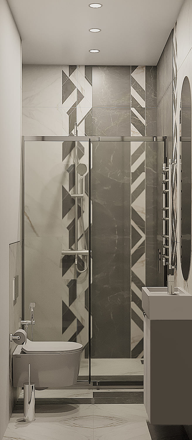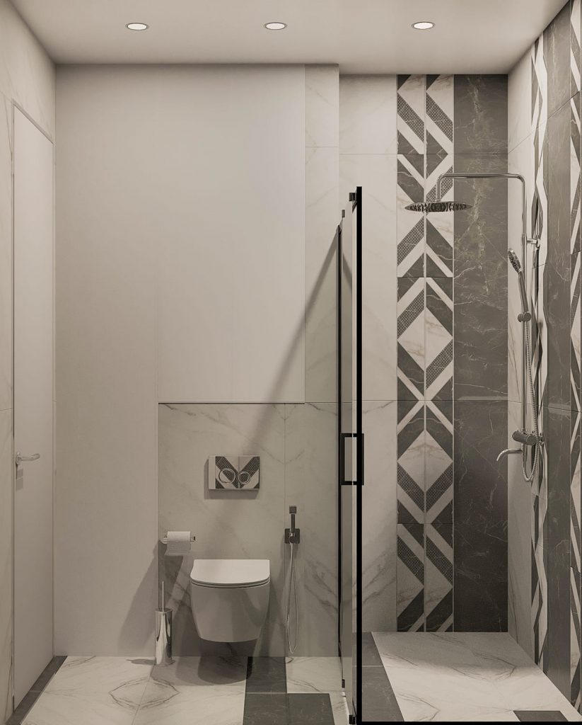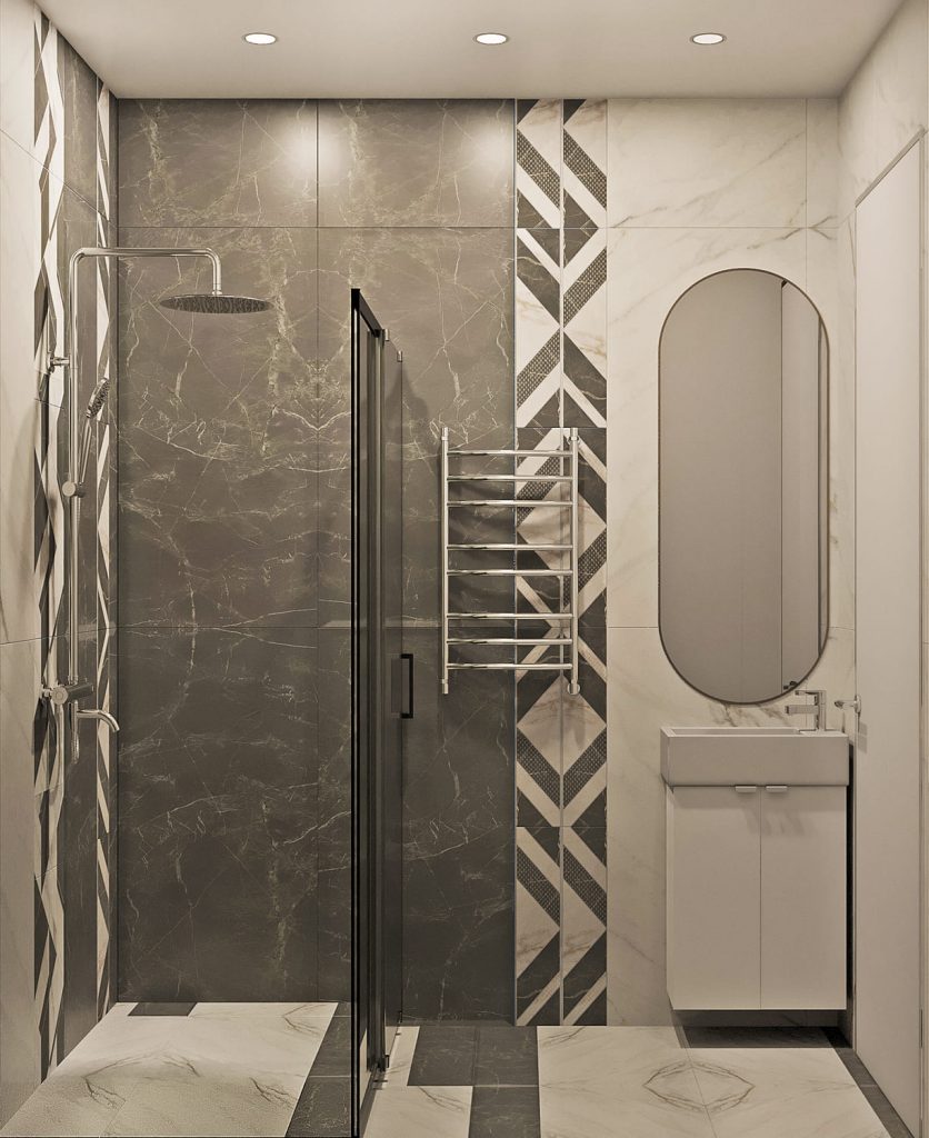 Здесь минимализм приобрёл графичный характер: светлый мрамор сочетается с глубокими серыми тонами и геометрическим рисунком плитки.