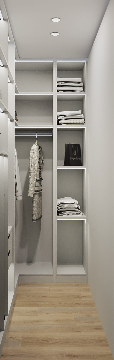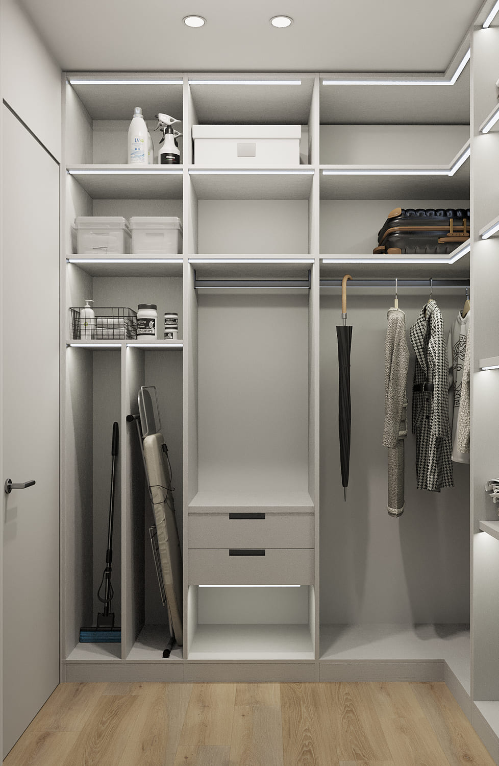 Система хранения организована удобно и логично: открытые секции, выдвижные ящики и отсеки различной высоты рассчитаны под конкретные задачи — от верхней одежды и чемоданов до бытовых принадлежностей. Встроенная подсветка по периметру полок обеспечивает мягкое освещение и подчёркивает геометрию интерьера. Тёплое дерево пола и нейтральные светло-серые фасады создают спокойную атмосферу порядка.