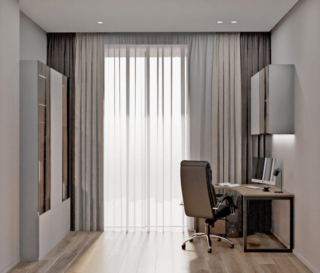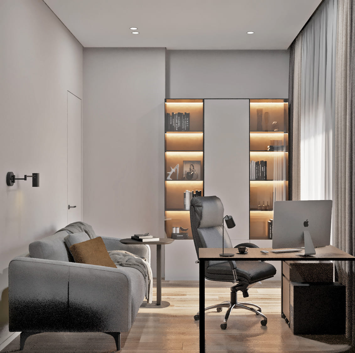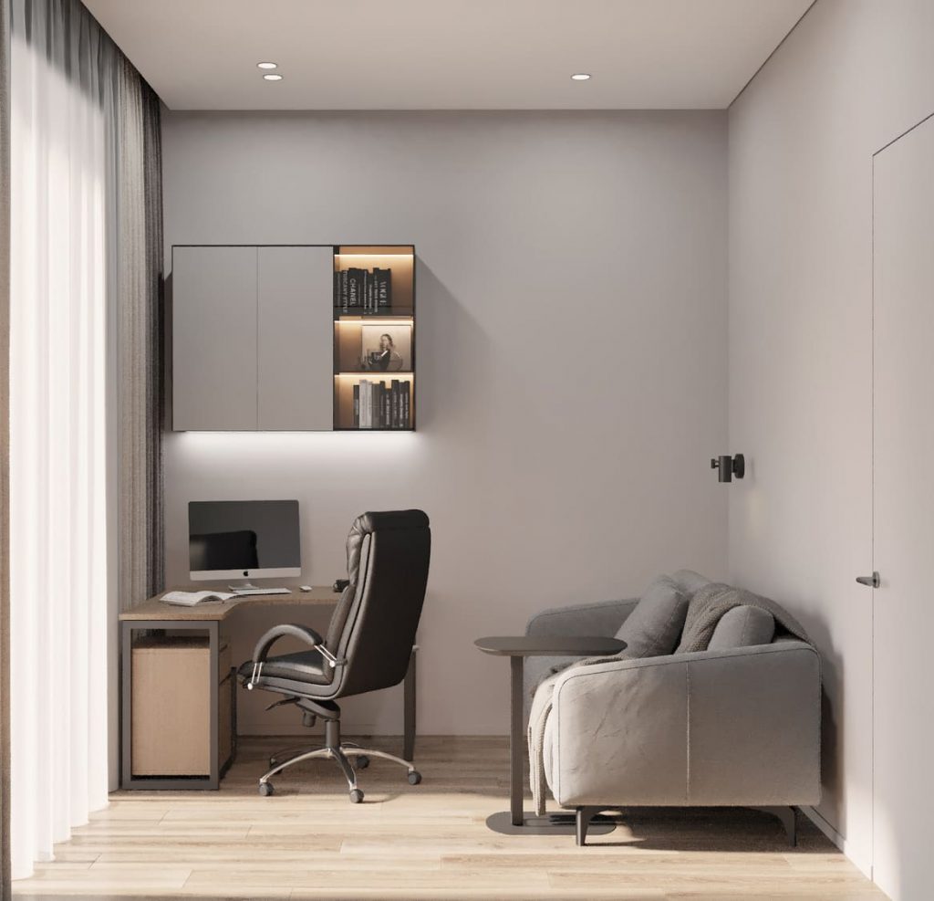 Рабочая зона оформлена просто и со вкусом: лаконичный стол с чёрным металлическим каркасом, эргономичное кресло и подвесные шкафы с подсветкой. На полках разместились книги и предметы декора — они добавляют характер и «живость» интерьеру.