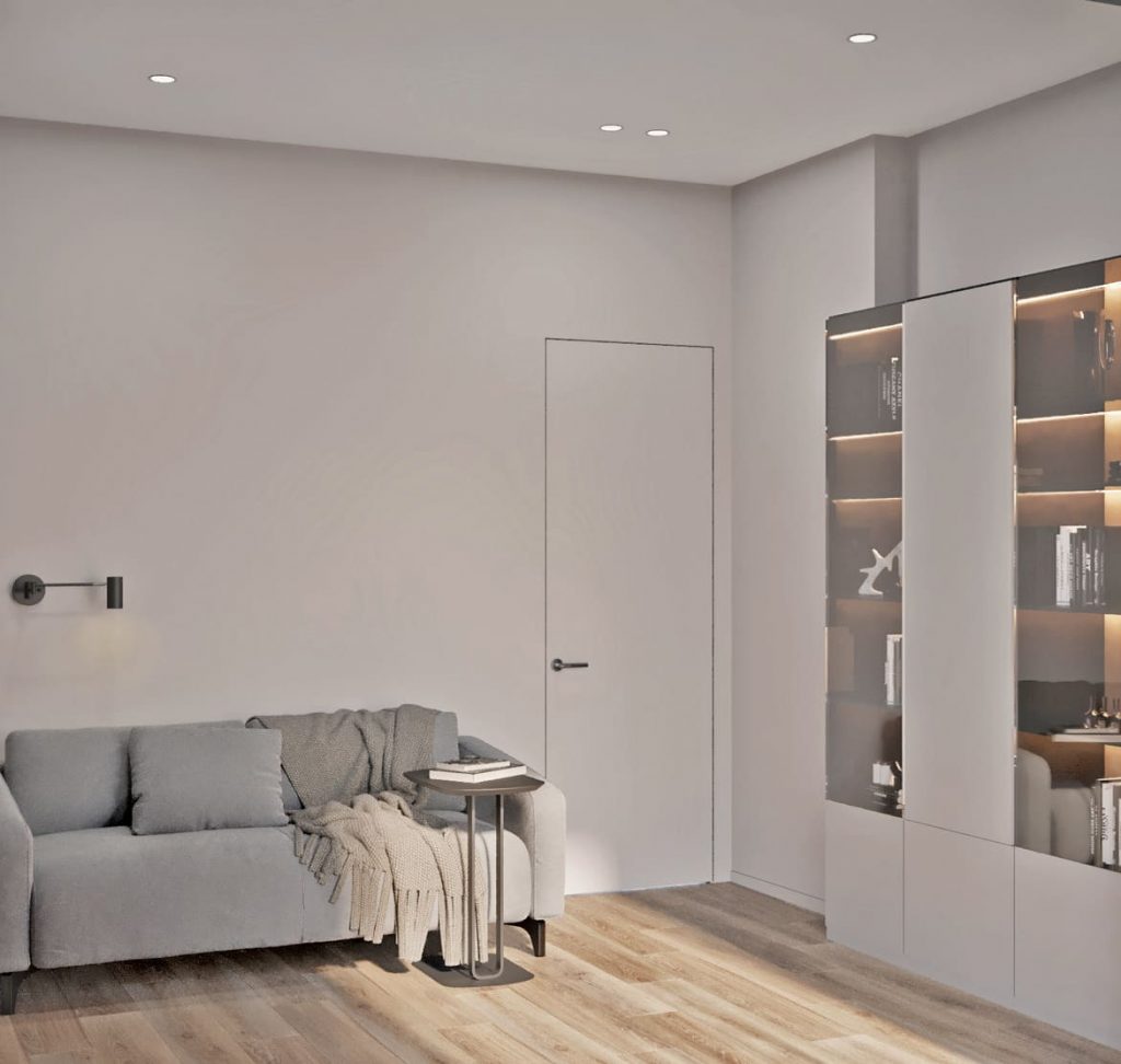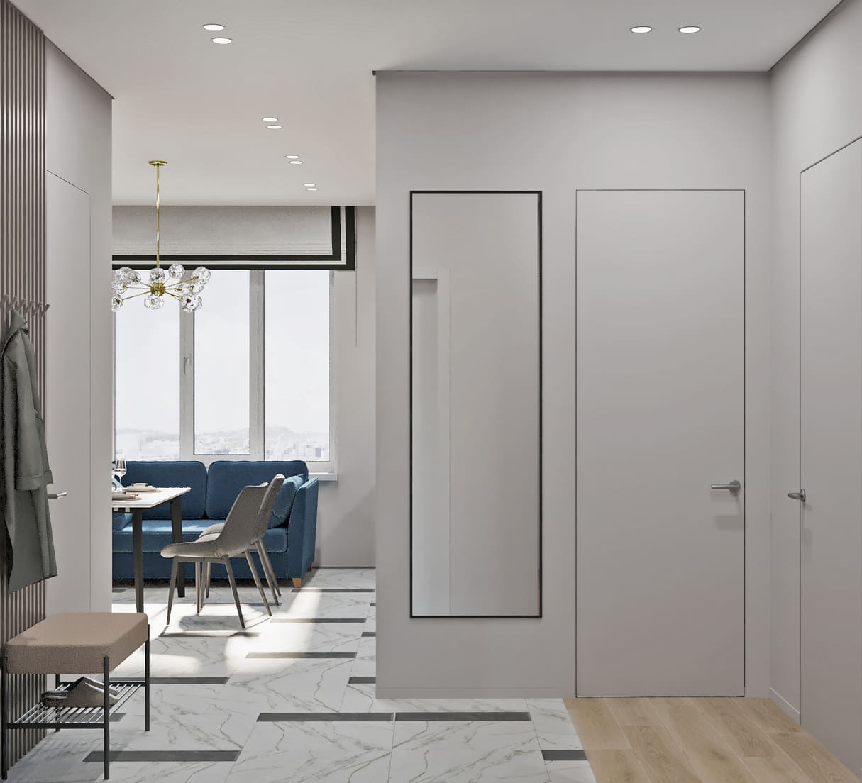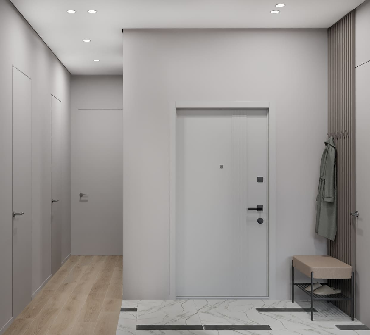 Скрытые двери и встроенные шкафы поддерживают минималистичную эстетику — прихожая выглядит аккуратно и лёгко, без визуального шума.