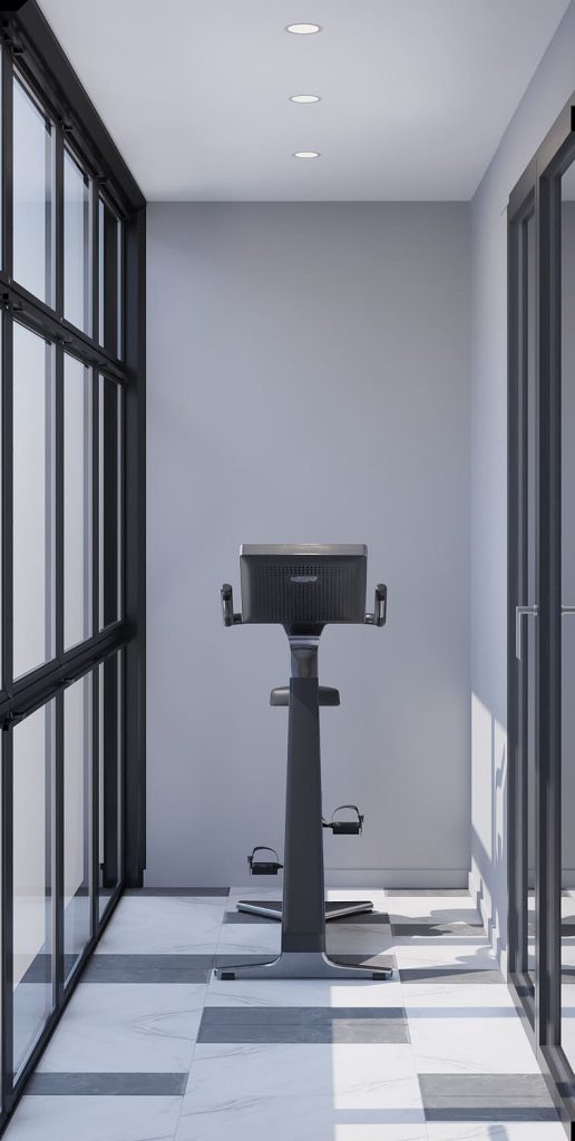 Лоджия в этой квартире стала полноценным продолжением жилого пространства — не просто балконом, а личной зоной для занятий спортом и отдыха. Благодаря панорамному остеклению и мягкой естественной подсветке помещение выглядит просторным и наполненным воздухом.