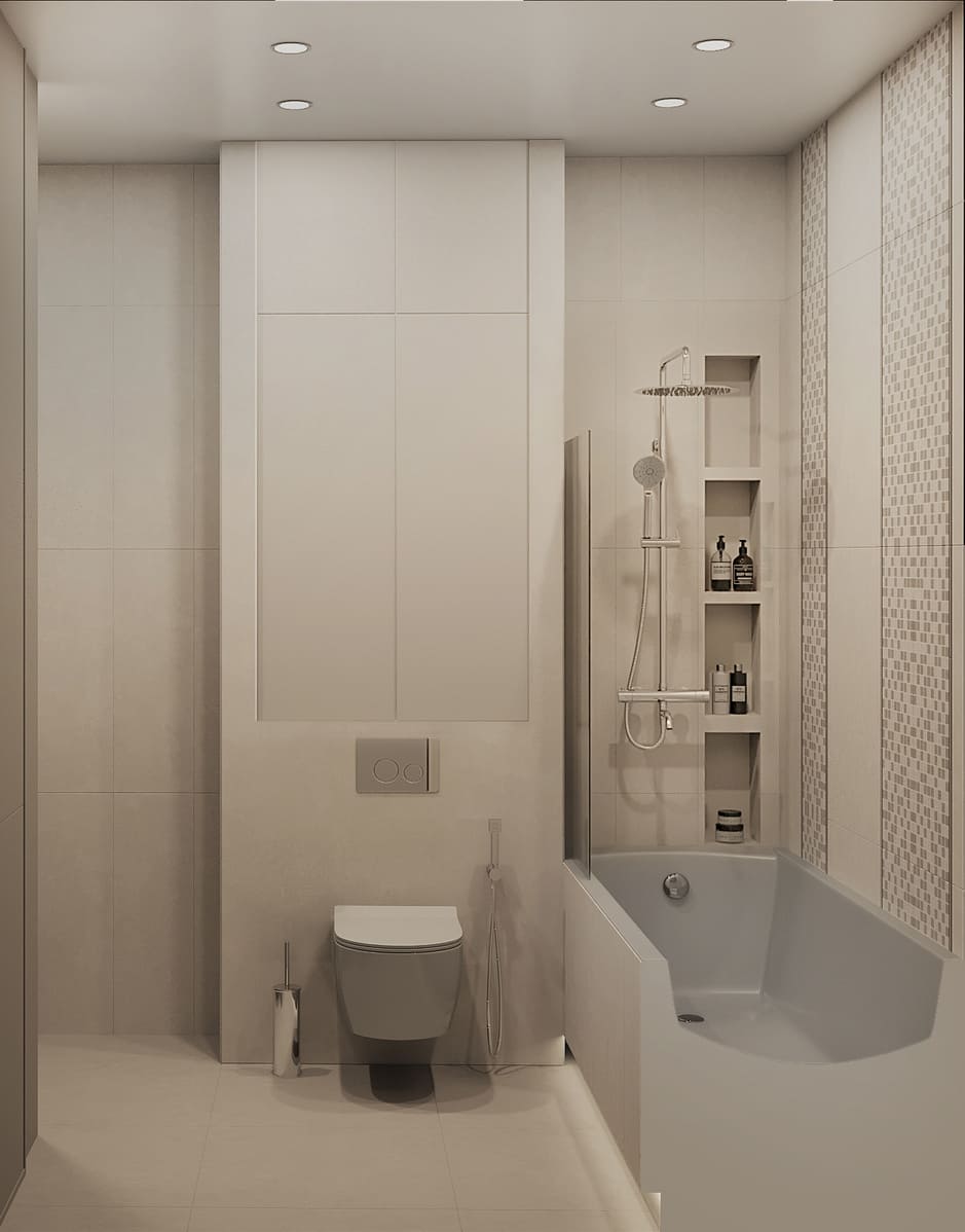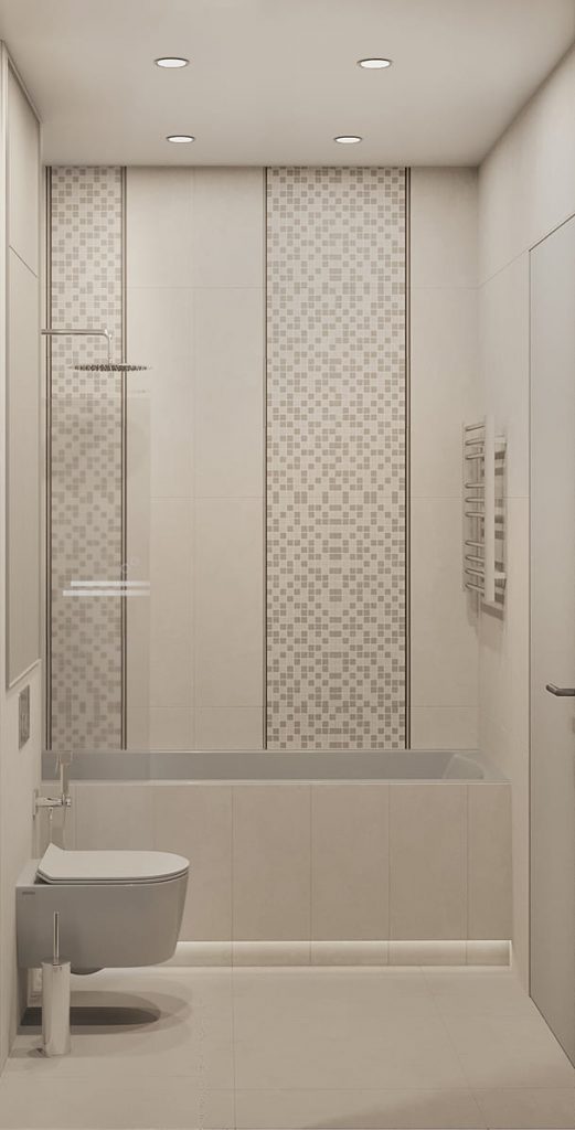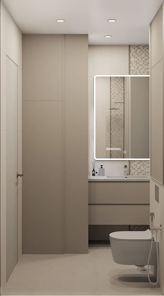 В отделке использованы спокойные бежевые тона с мягкими графитовыми акцентами. Фоном служит крупноформатная плитка, а декоративные вставки из мозаики добавляют интерьеру динамику и текстуру.
