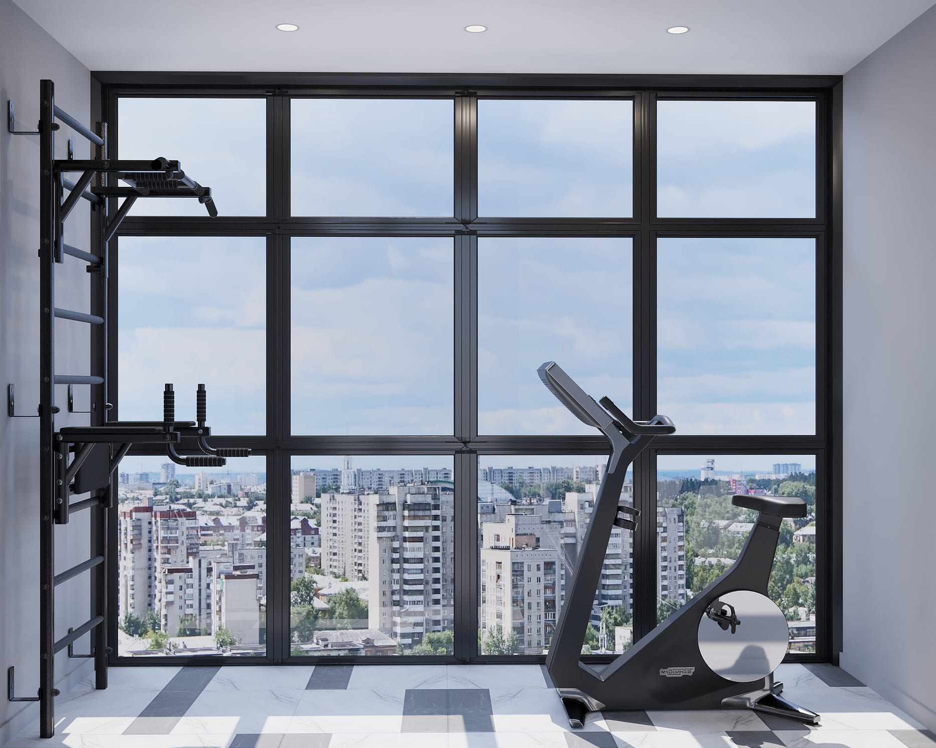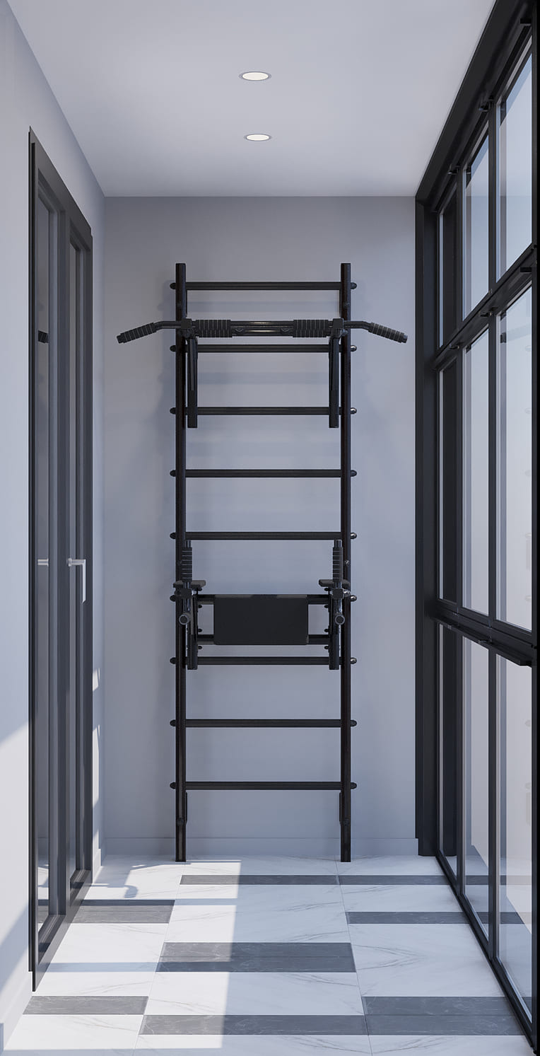 На стене установлена спортивная шведская лестница, рядом — кардиозона с велотренажёром. Такой мини-зал идеально вписался в интерьер: строгие линии чёрных конструкций поддерживают общую графичность квартиры, а мраморная плитка пола визуально связывает лоджию с остальными помещениями.