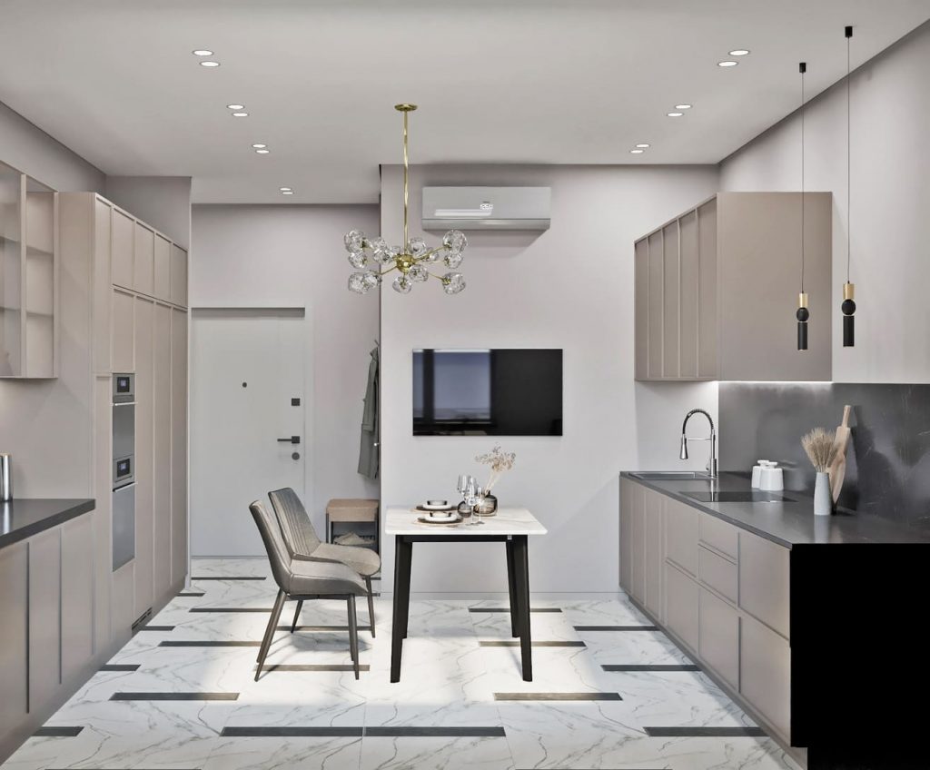 Контрастная столешница и фартук с фактурой тёмного камня визуально структурируют композицию, а встроенная подсветка создаёт мягкое вечернее свечение. Центральный элемент — обеденный стол с тонкой столешницей и изящными ножками, над которым расположена стеклянная люстра с латунной фурнитурой.