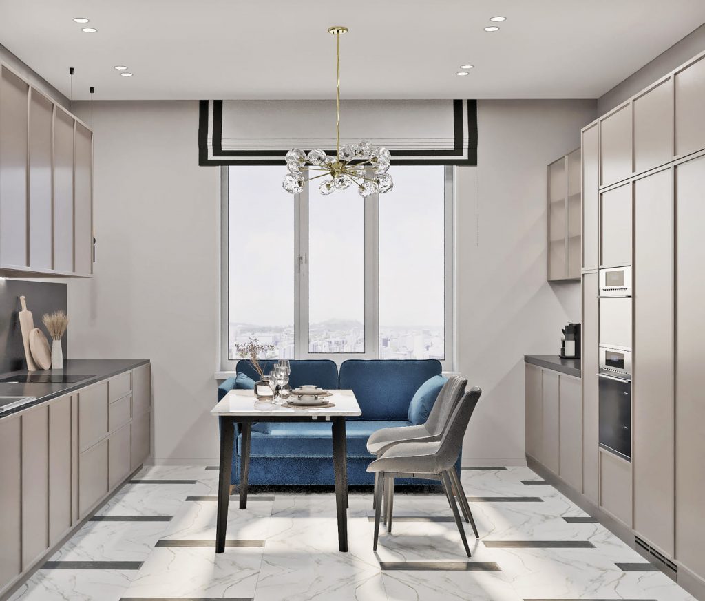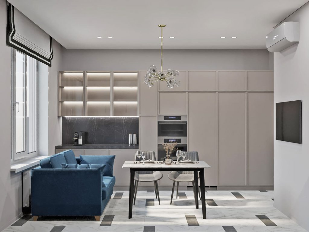 Здесь всё построено на балансе между функциональностью и уютом: лаконичные фасады в мягком бежево-сером оттенке создают ощущение спокойствия, а глубокий синий диван у окна добавляет интерьеру выразительный акцент.