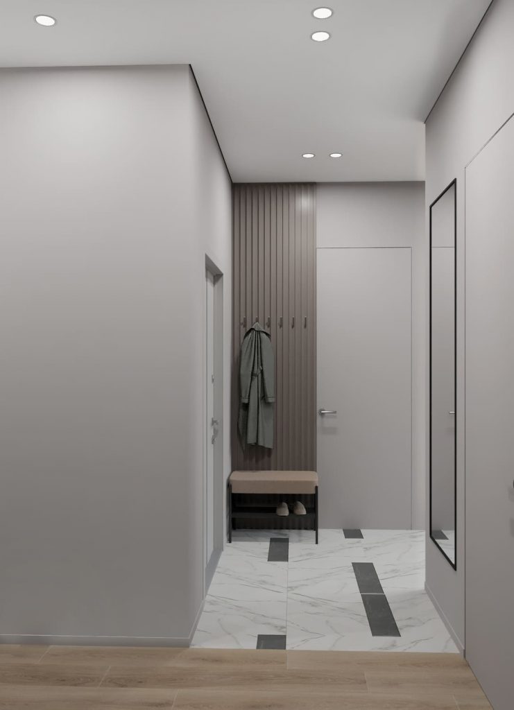 Главный акцент — функциональная зона у входа: вертикальные панели в тёплом сером оттенке создают фон для вешалки и мягкой банкетки.
