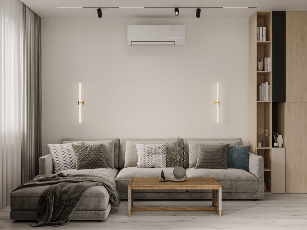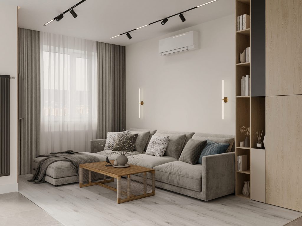 Зона отдыха оформлена спокойно и лаконично: диван в фактурной серой ткани, светлые стены, акценты из дерева и латунные детали в освещении. Направленный свет и настенные бра создают мягкое зонирование и уютный вечерний сценарий.