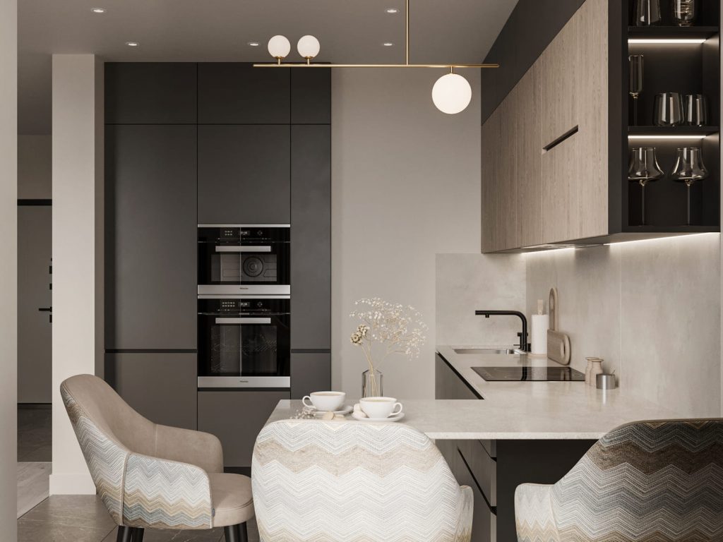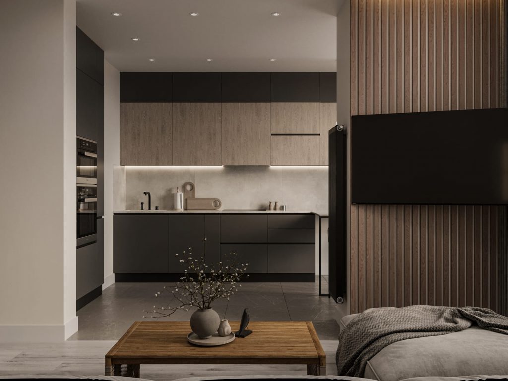 Интерьер выстроен на контрасте тёплого дерева и глубокого графита: нижние фасады выполнены в матовом сером, а верхние — в оттенке светлого дуба. Подсветка подчёркивает линии и визуально «поднимает» пространство, делая его лёгким.