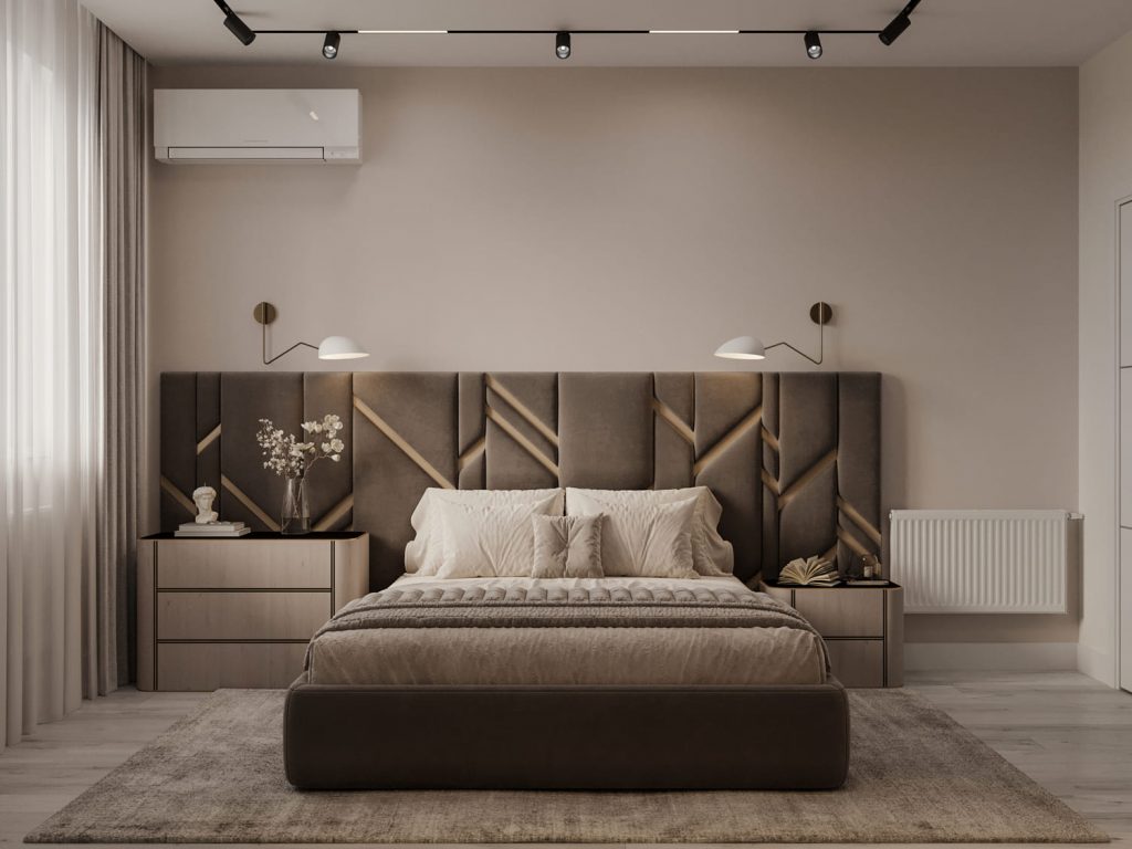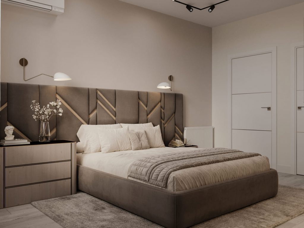 Центральным элементом стала мягкая изголовная панель с геометрическим рисунком. Глубокие линии и вставки под латунь придают композиции динамику, а тёплая фактура ткани делает пространство более уютным.