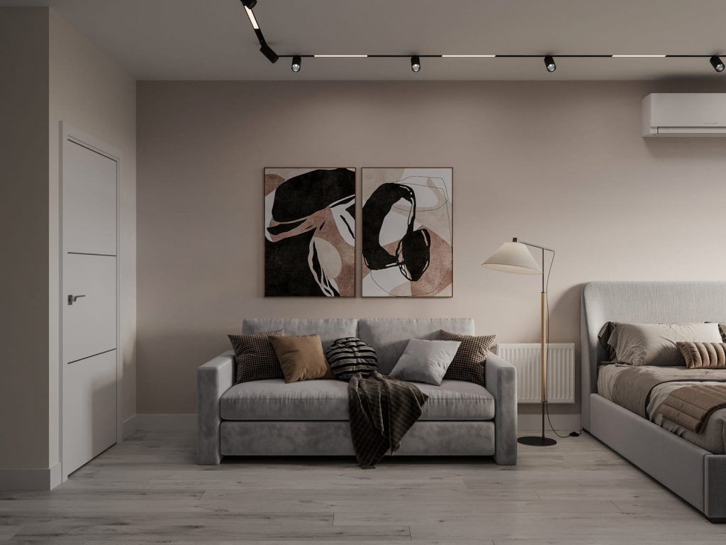 Нейтральная палитра — тёплый беж, серый и кофейный — помогает создать ощущение уюта и тепла. Мягкий рассеянный свет, поступающий через полупрозрачные шторы, наполняет комнату естественным сиянием.