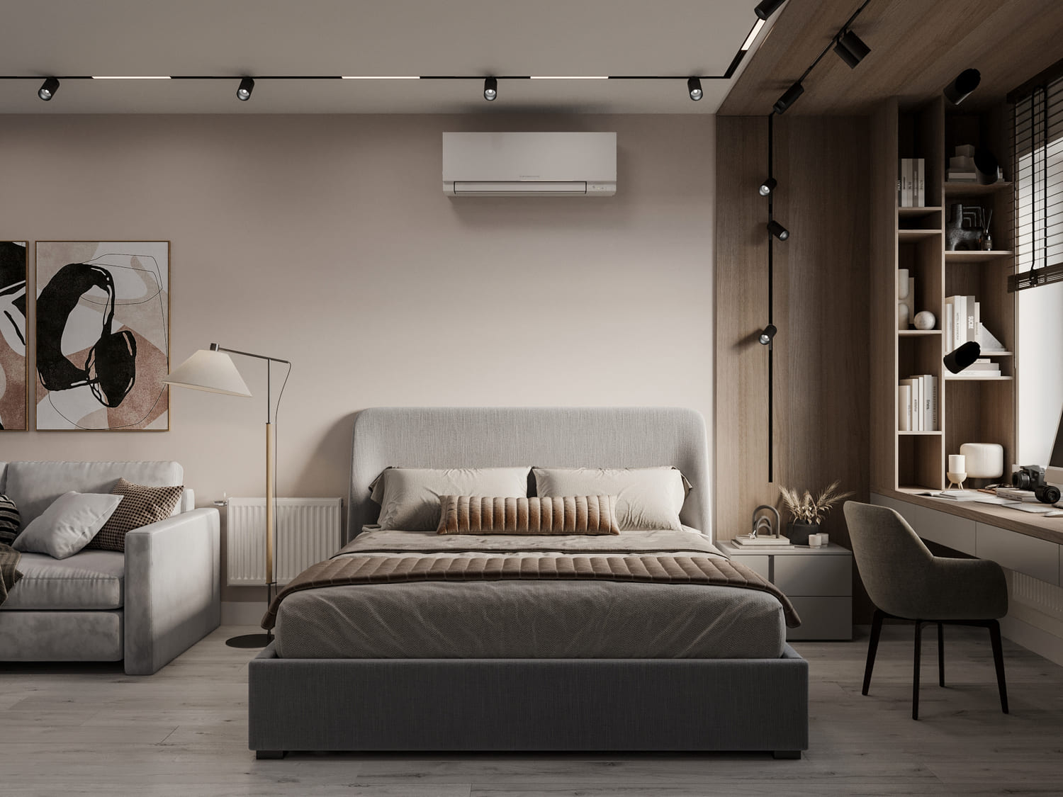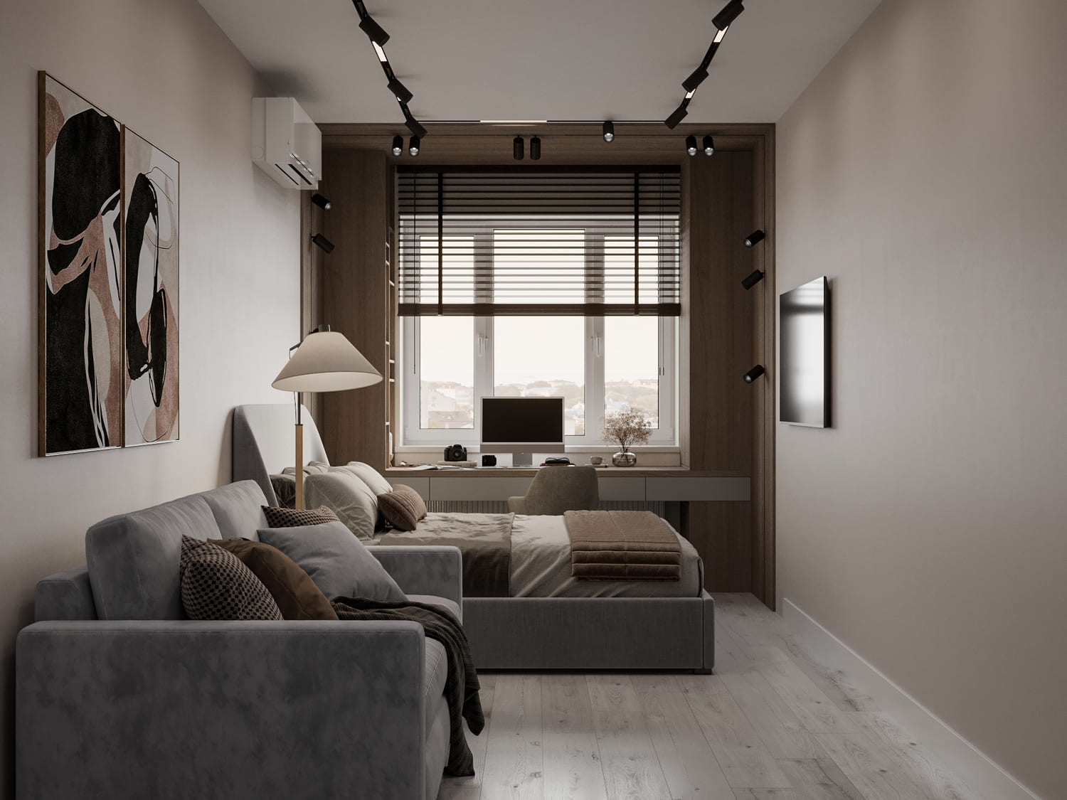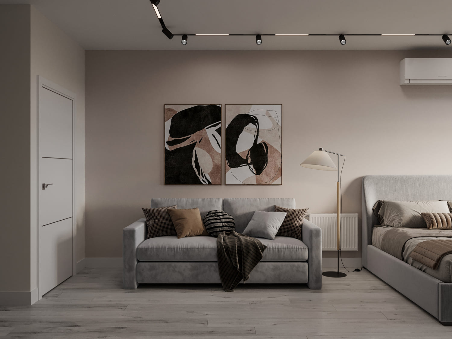 Палитра тёплая и спокойная: оттенки бежевого, серого и древесного коричневого создают гармоничное, сбалансированное настроение. Современные трековые светильники дополняют композицию и позволяют легко менять освещение под разные задачи.