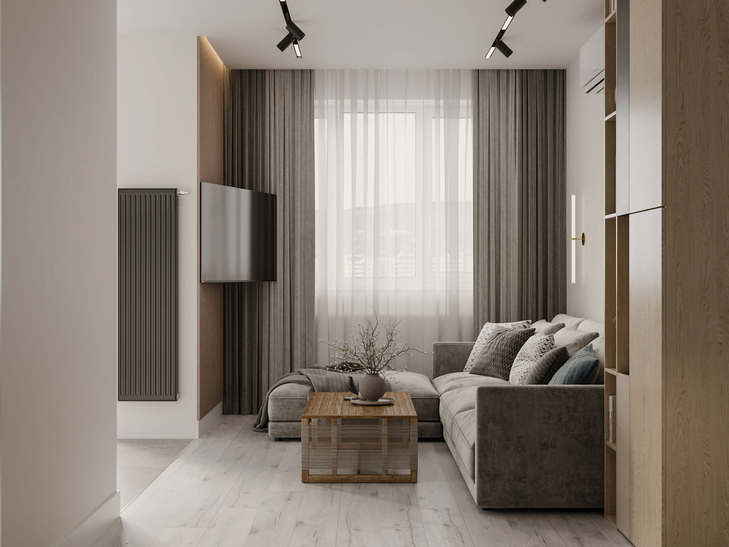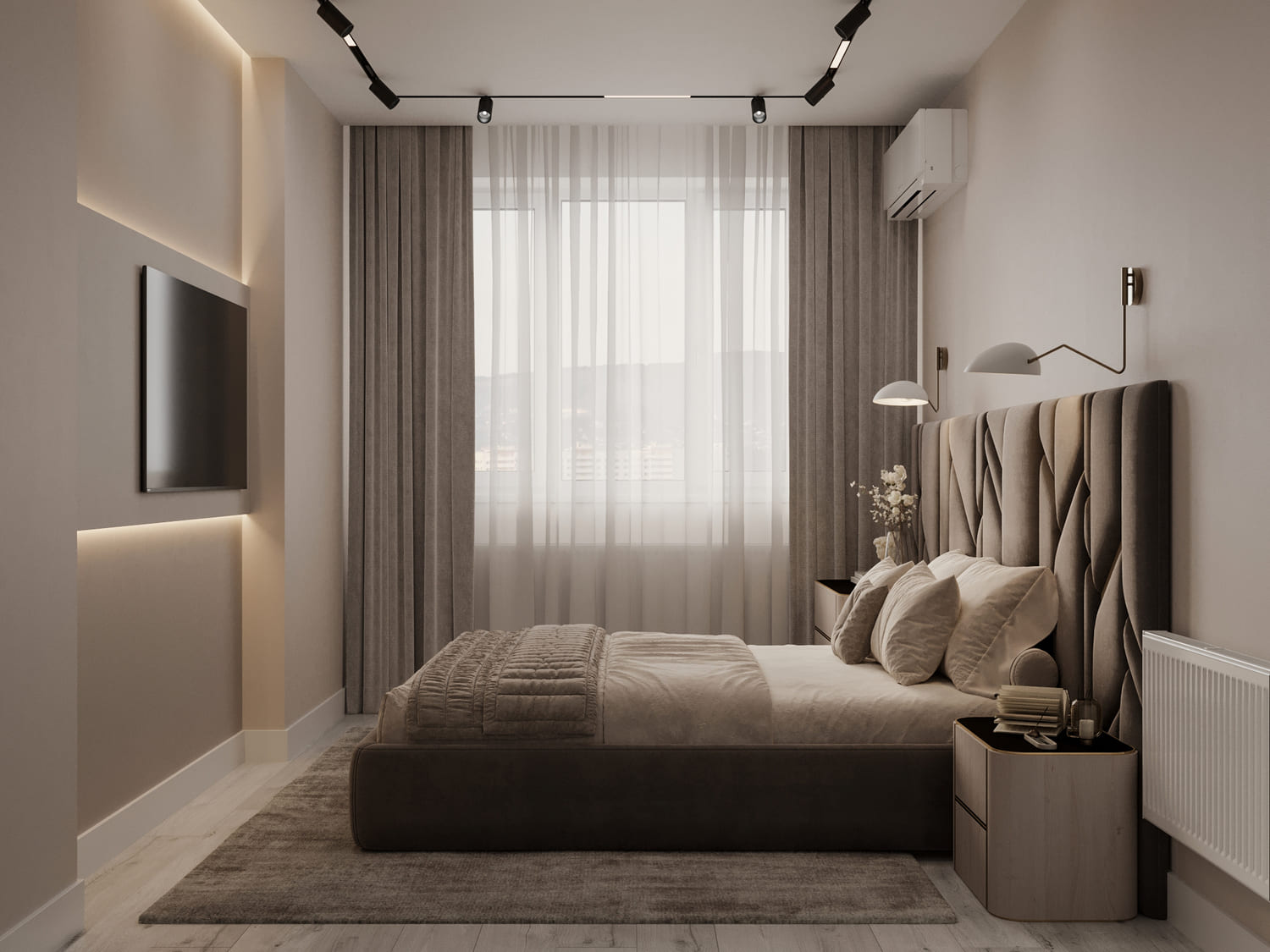 Нейтральная палитра — тёплый беж, серый и кофейный — помогает создать ощущение уюта и тепла. Мягкий рассеянный свет, поступающий через полупрозрачные шторы, наполняет комнату естественным сиянием.