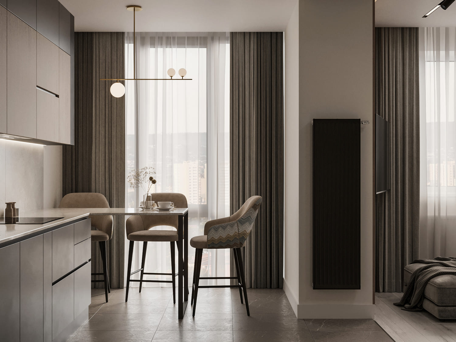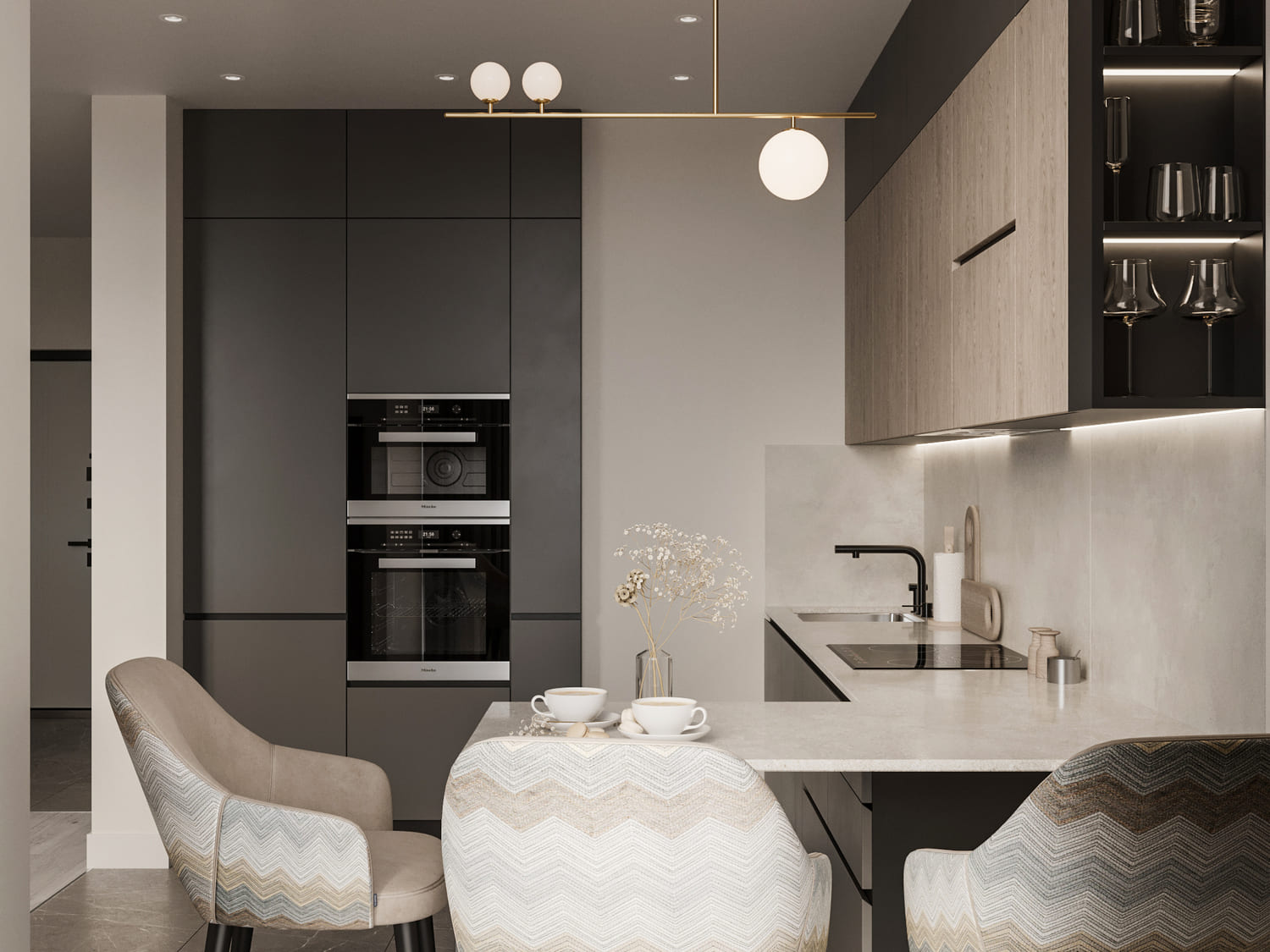 Встроенная техника интегрирована в высокий блок, чтобы сохранить ощущение цельности. Вместо обеденного стола — барная стойка у окна, которая экономит место и визуально расширяет комнату. Барные стулья с мягкой обивкой и геометрическим рисунком поддерживают общую палитру и добавляют тактильного уюта.
