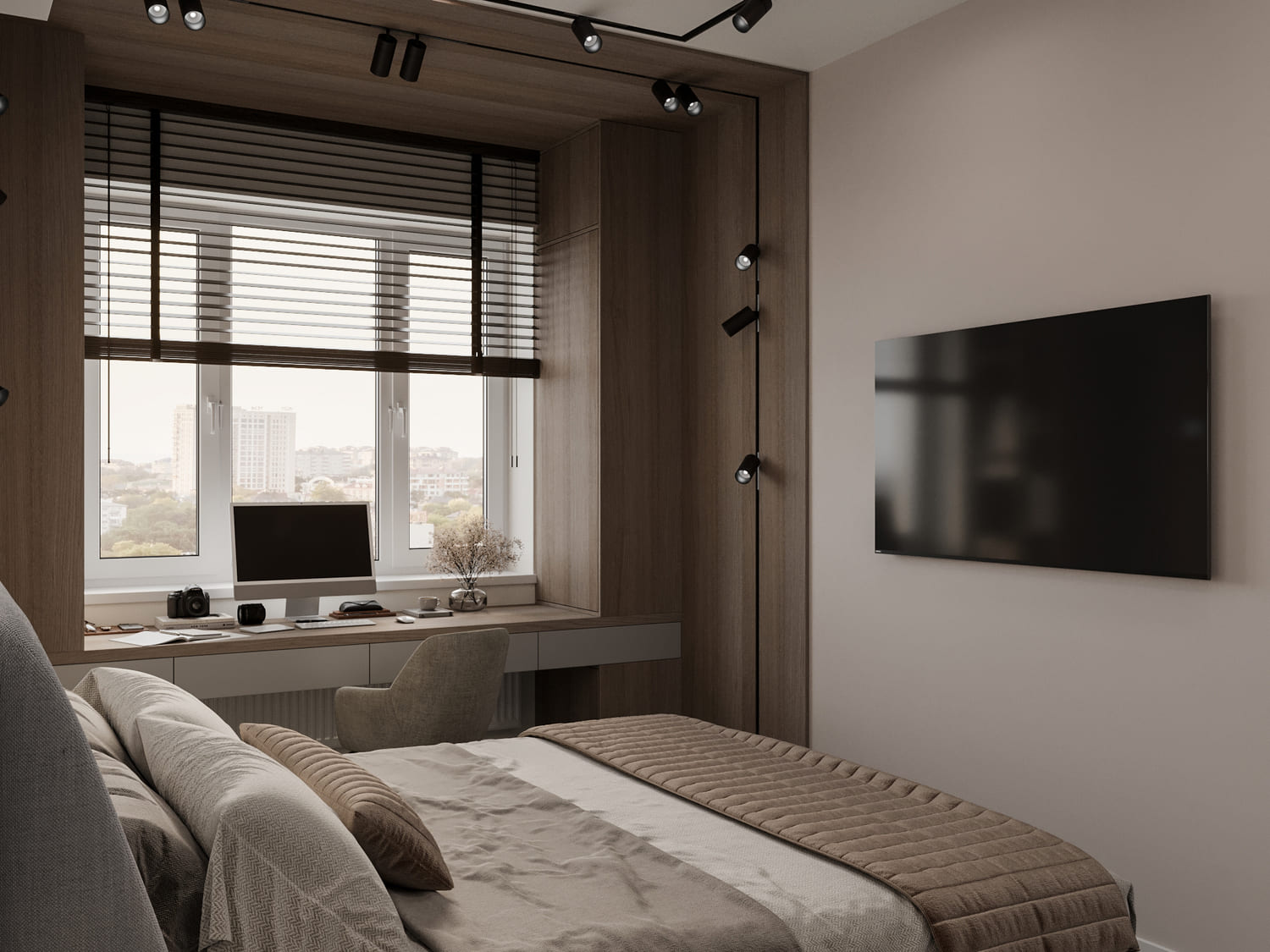 Вторая комната совмещает функции гостевой спальни и домашнего кабинета. Пространство продумано так, чтобы быть одновременно уютным для отдыха и комфортным для работы.