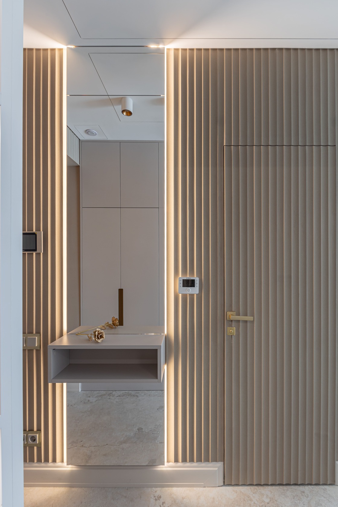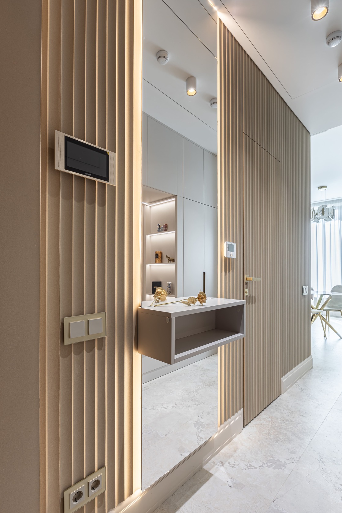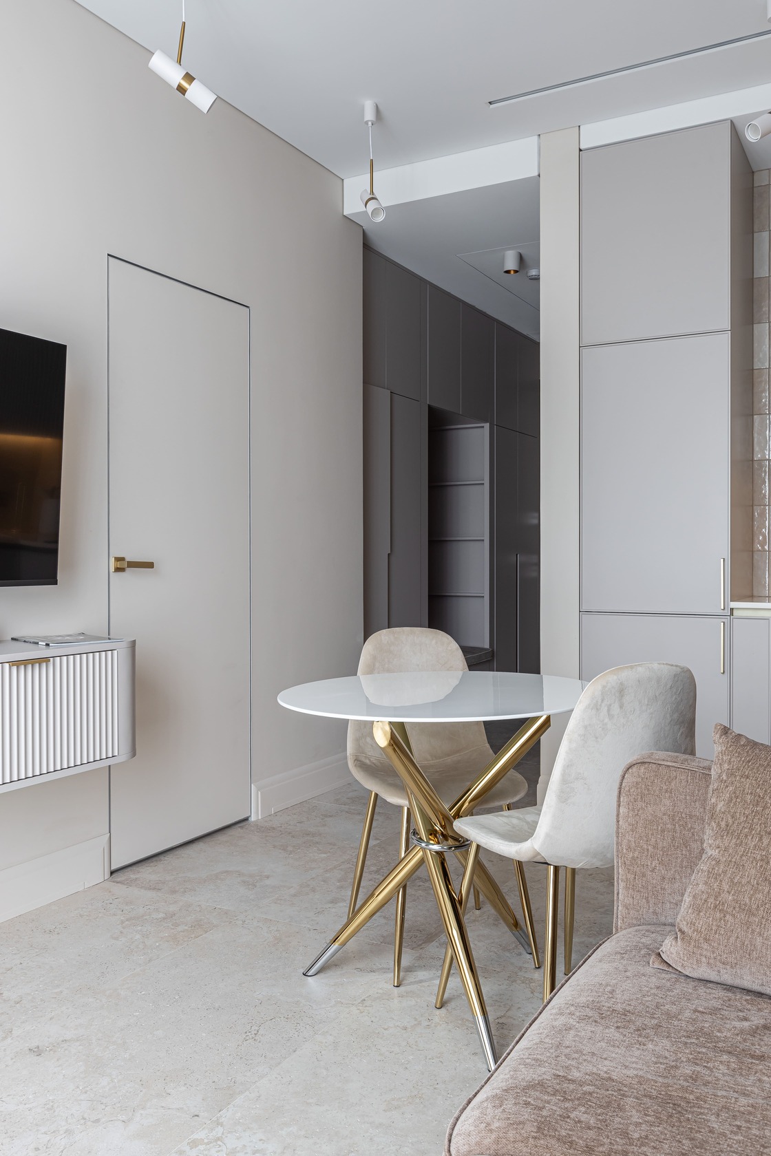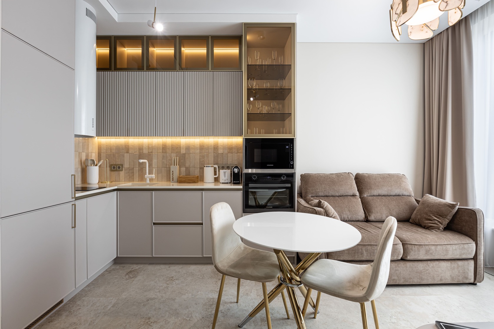 Ремонт апартаментов для последующей сдачи в аренду, в светлых кофейных оттенках, с прихожей, кухней-гостиной, спальней и двумя санузлами