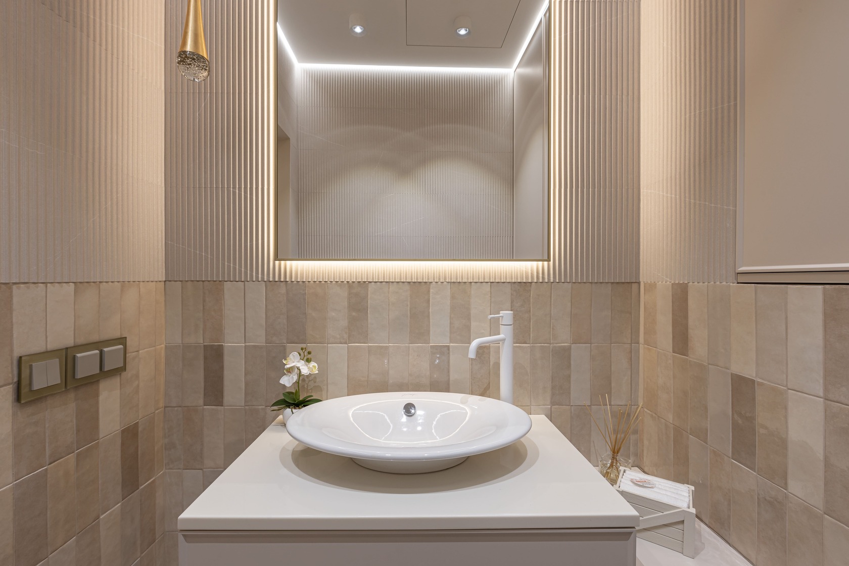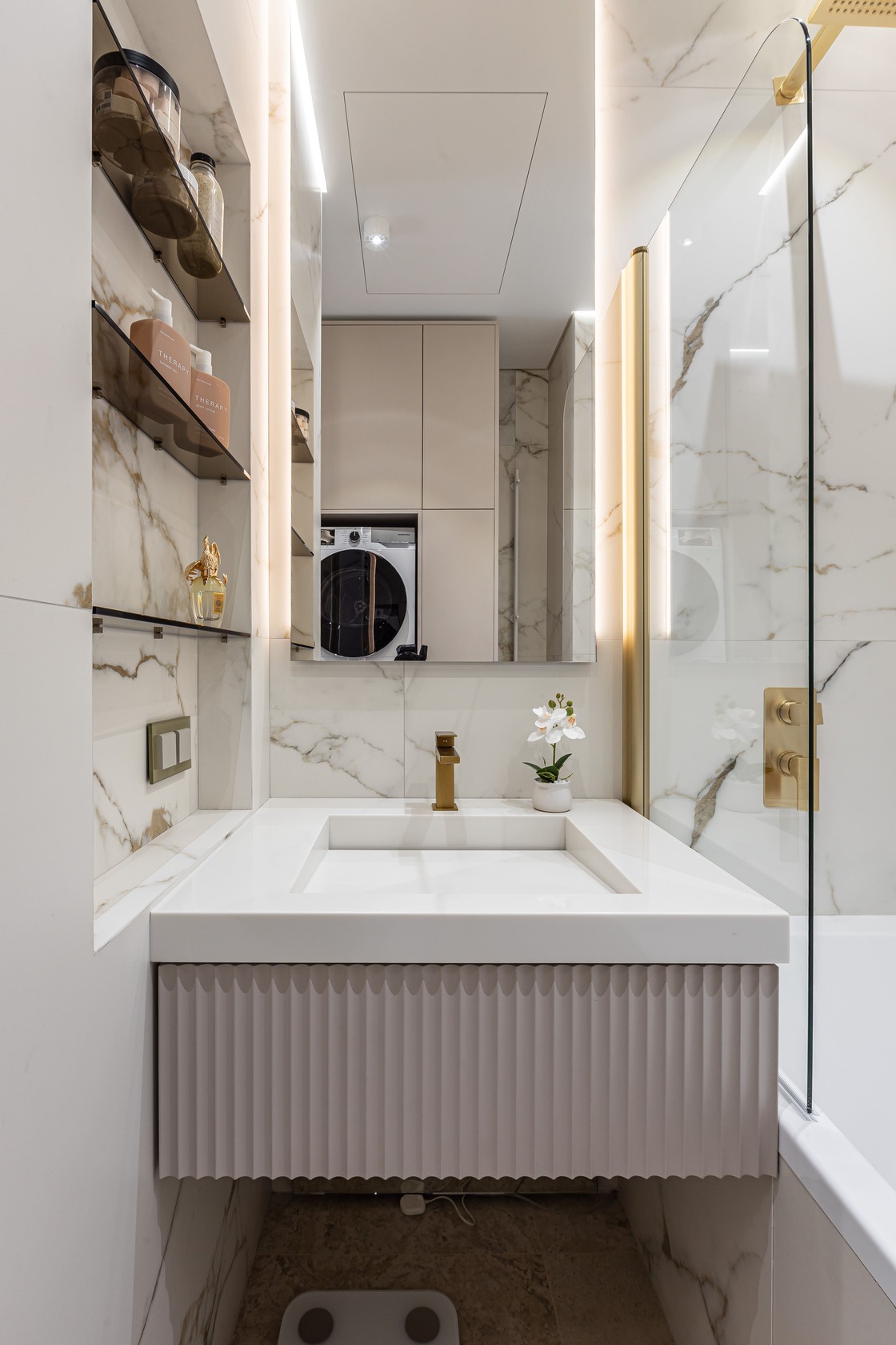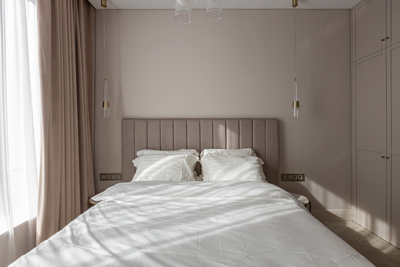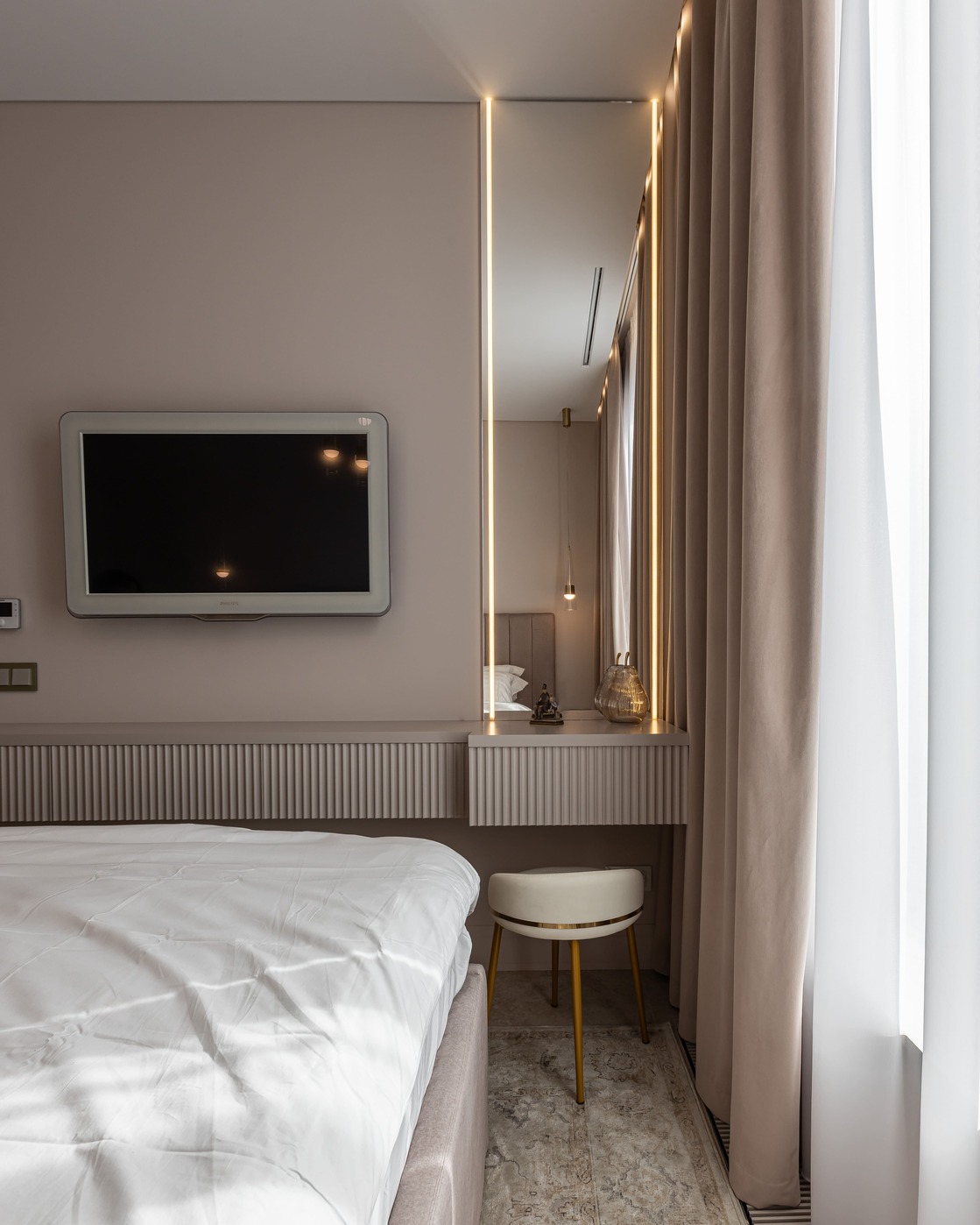 Ремонт апартаментов для последующей сдачи в аренду, в светлых кофейных оттенках, с прихожей, кухней-гостиной, спальней и двумя санузлами