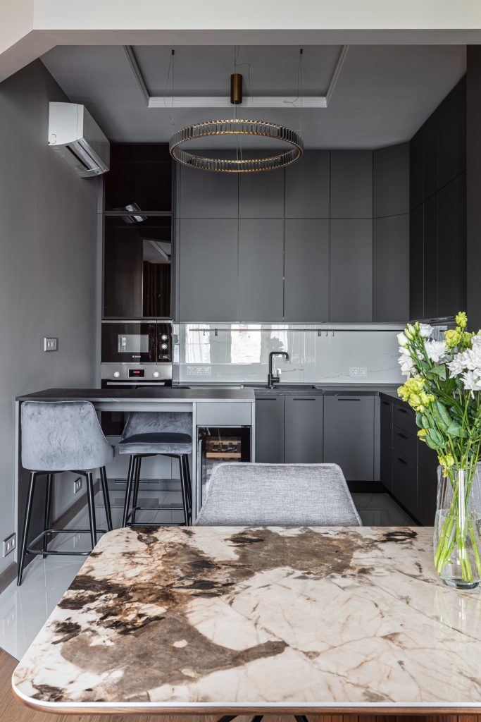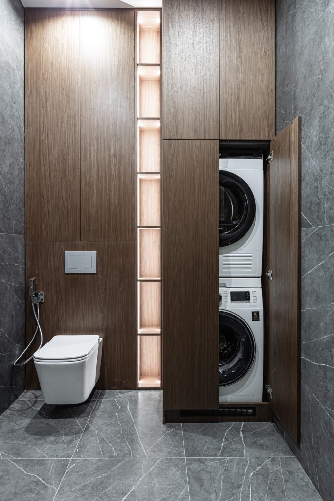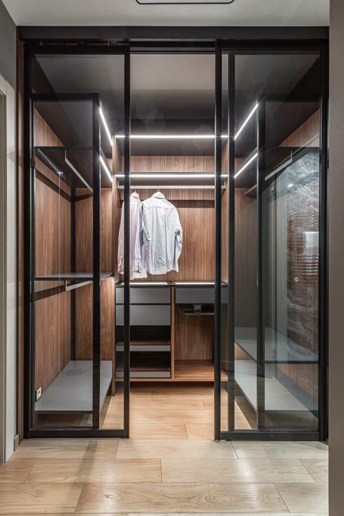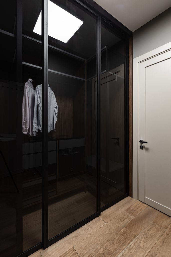 Ремонт однокомнатных апартаментов с меблировкой и изготовлением мебели от Domeo, в минималистичном стиле, с прихожей, кухней, гостиной, спальней, гардеробной и двумя санузлами
