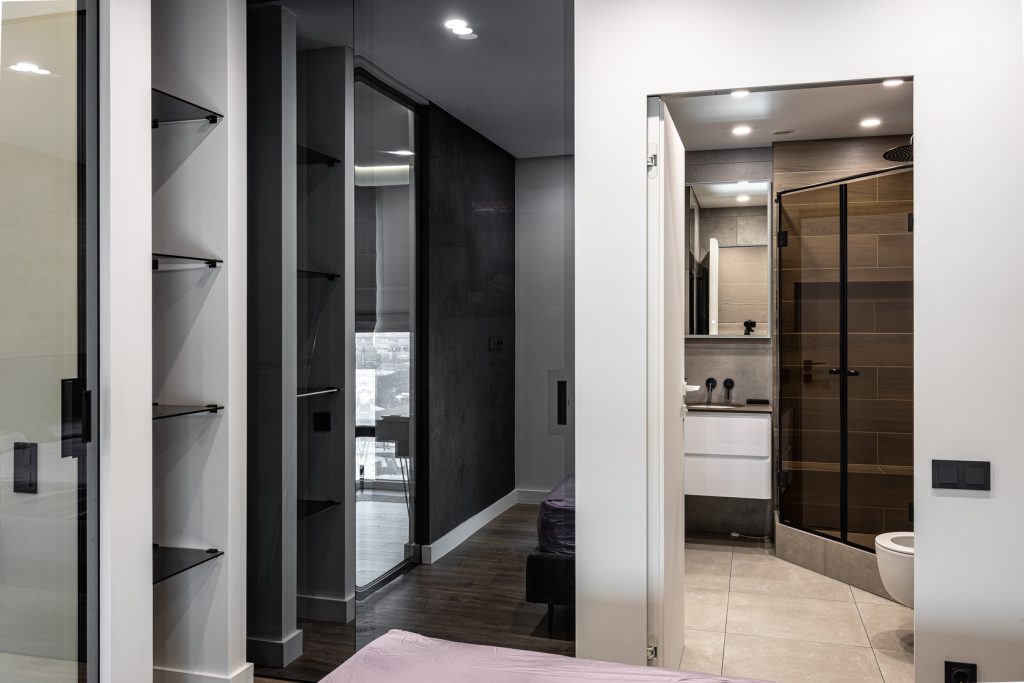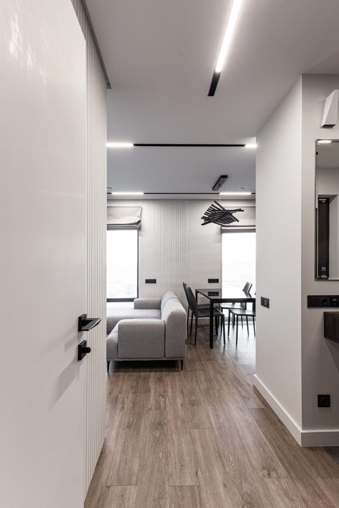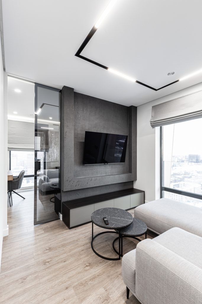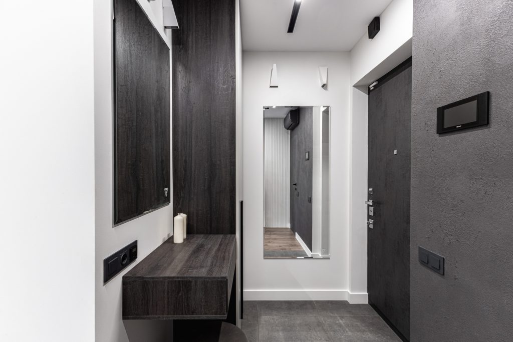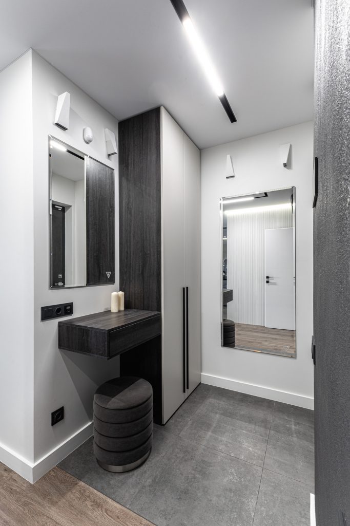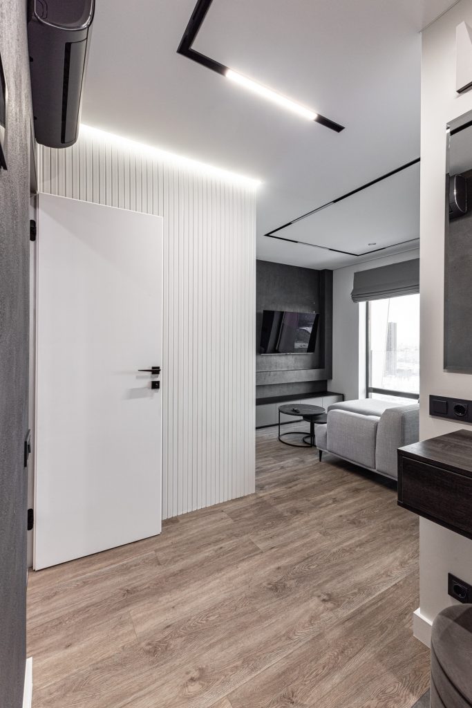 Ремонт евротрешки с меблировкой и изготовлением мебели от Domeo, с круговой планировкой и изысканным оформлением в стиле минимализм для взрослого мужчины, с прихожей, кухней-гостиной, спальней, кабинетом, гардеробной и санузлом