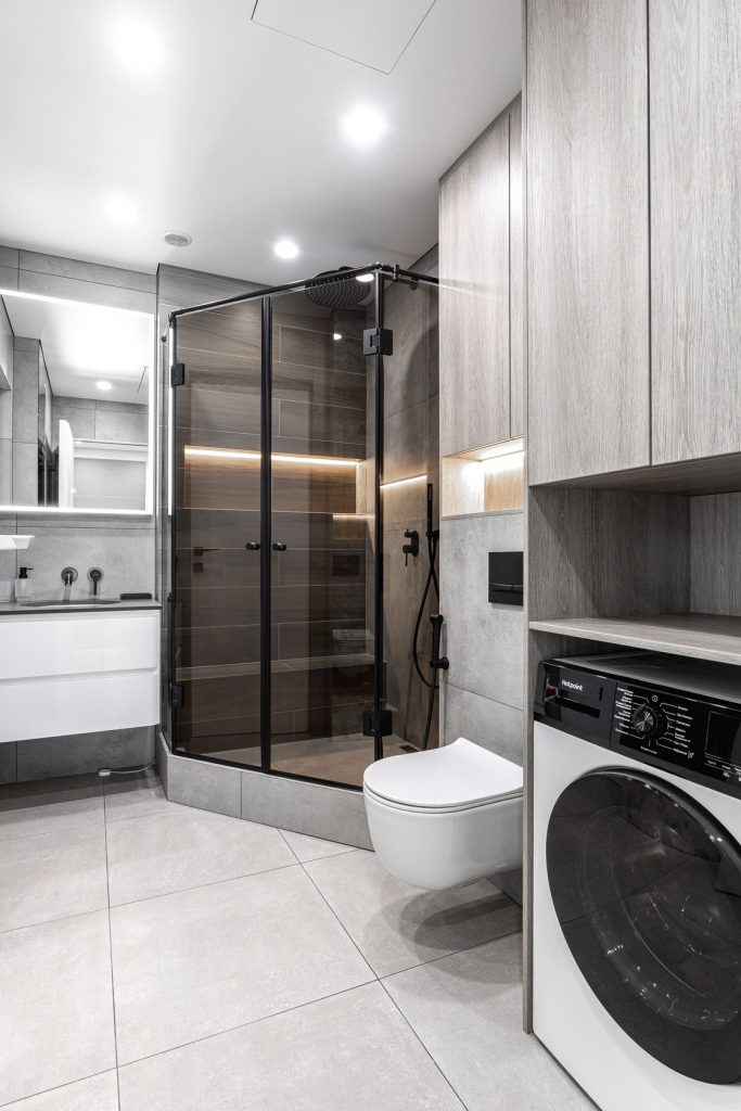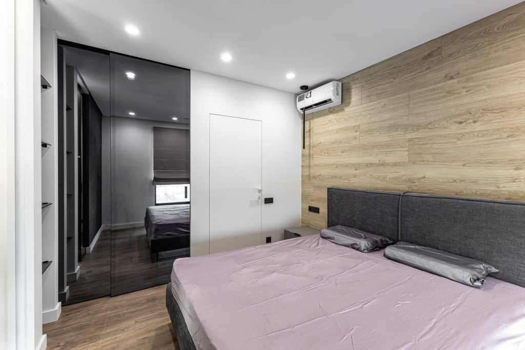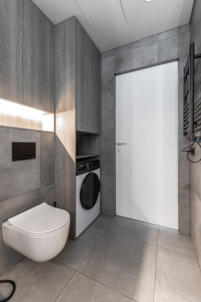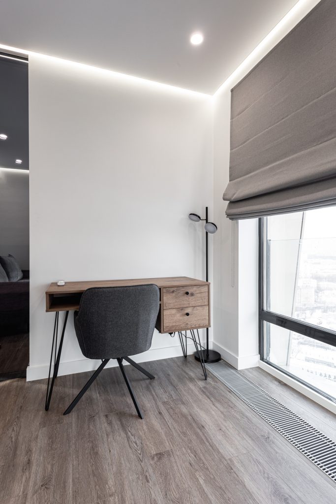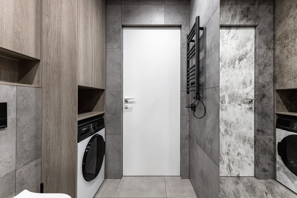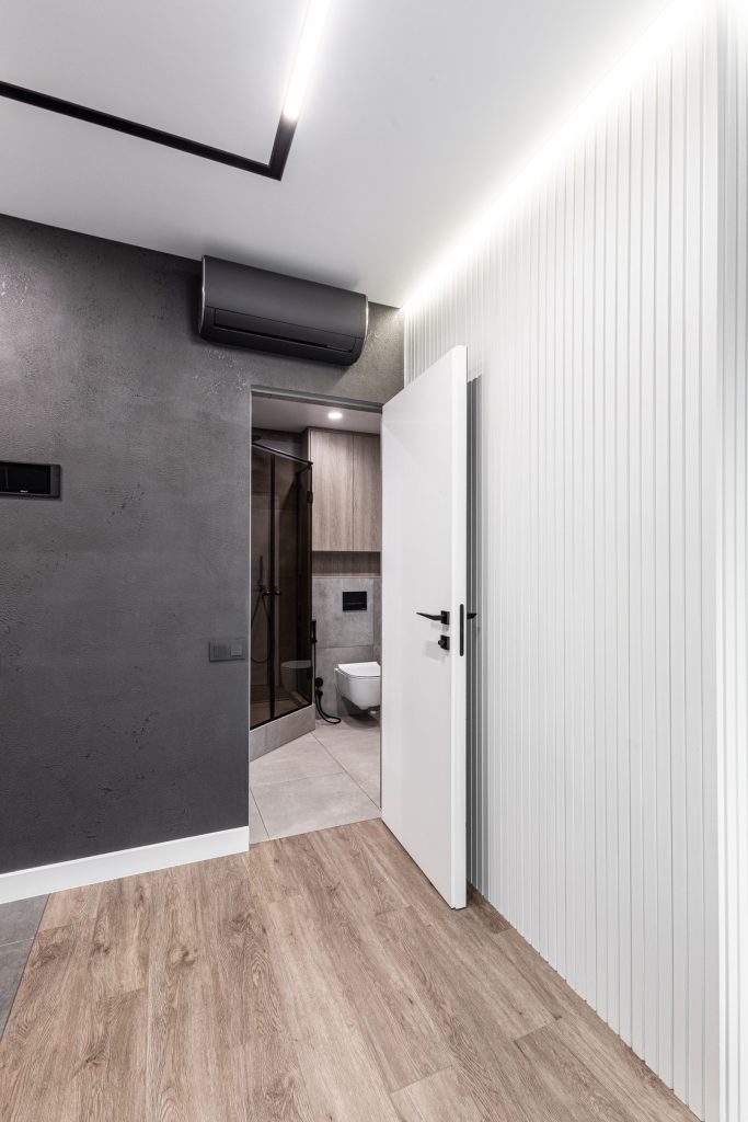 Ремонт евротрешки с меблировкой и изготовлением мебели от Domeo, с круговой планировкой и изысканным оформлением в стиле минимализм для взрослого мужчины, с прихожей, кухней-гостиной, спальней, кабинетом, гардеробной и санузлом