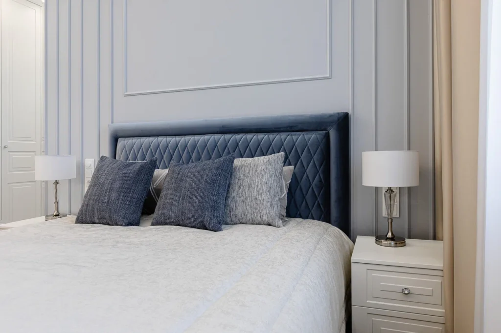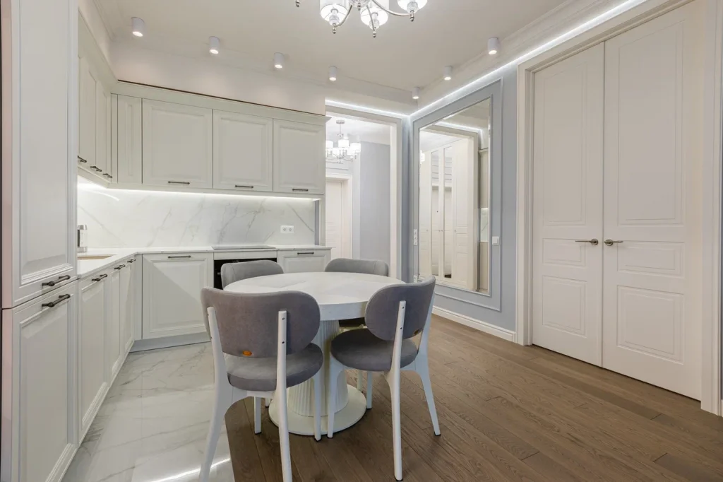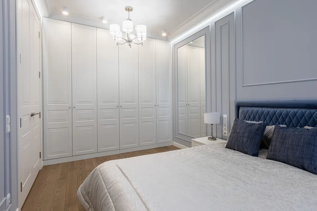 Ремонт евродвушки с меблировкой и изготовлением мебели от Domeo, с интерьером, сочетающим в себе нежно-голубой и нежно-белый цвета, с прихожей, кухней-гостиной, спальней, гардеробной, санузлом и балконом
