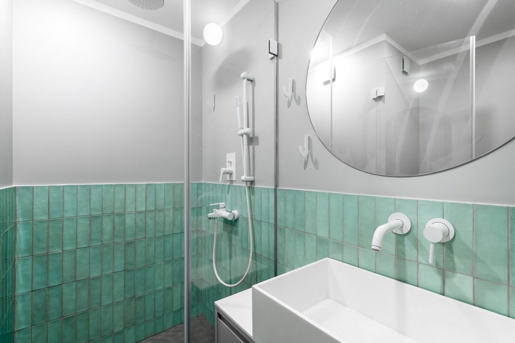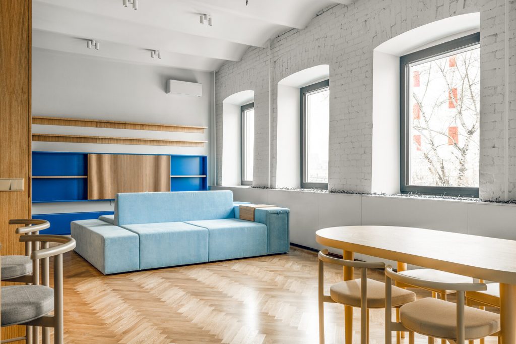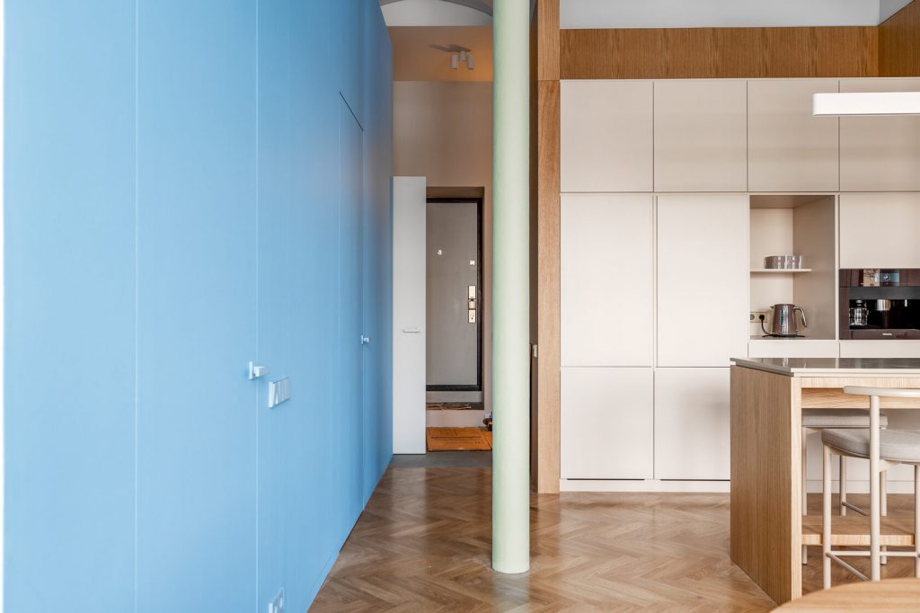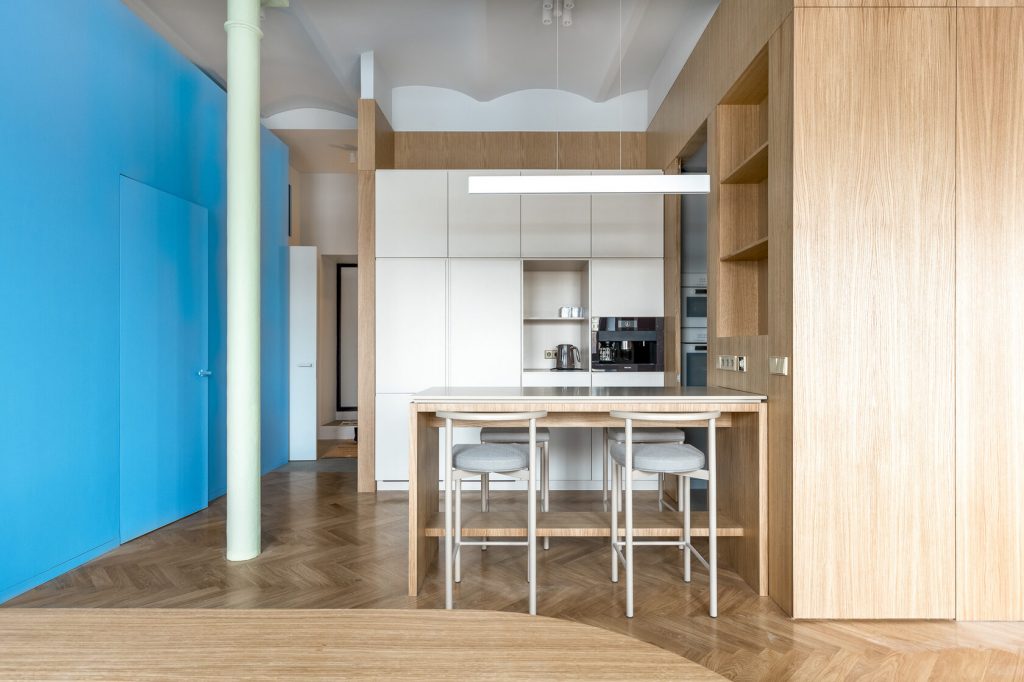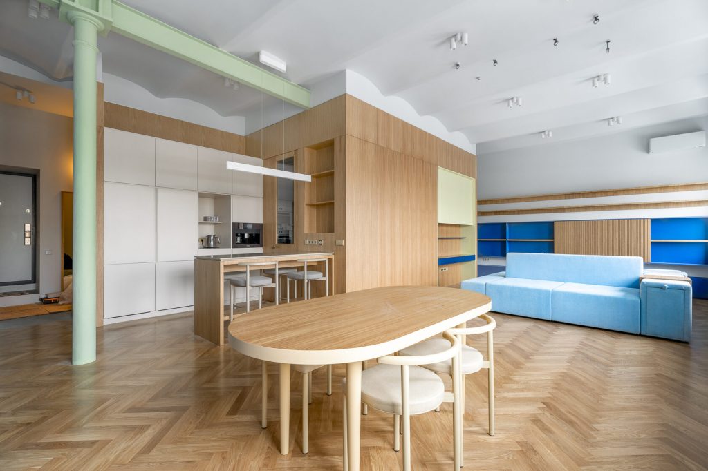 Кухня-гостиная выполнена в голубом и фисташковом цветах — они очень эффектно сочетаются с деревом в отделке. За счет белого цвета все комнаты органично сливаются воедино.