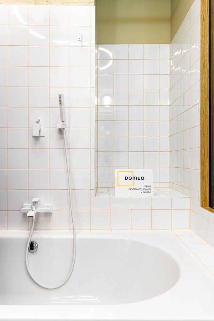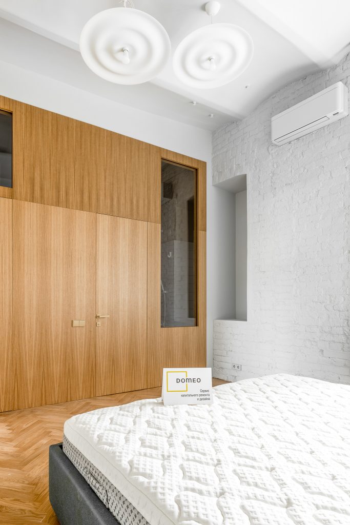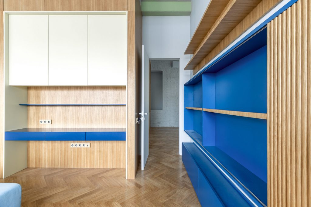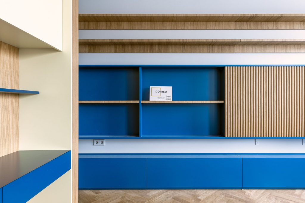 Ремонт трёхкомнатной квартиры с меблировкой и изготовлением мебели от Domeo, в светлых тонах с добавлением голубого и фисташкового цветов, эффектно сочетающихся с деревом в отделке, с прихожей, кухней-гостиной, мастер-спальней, гостевой и детской комнатами, гардеробной и двумя санузлами