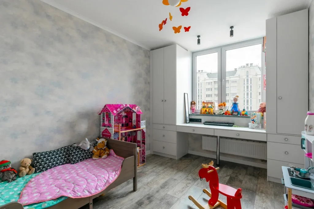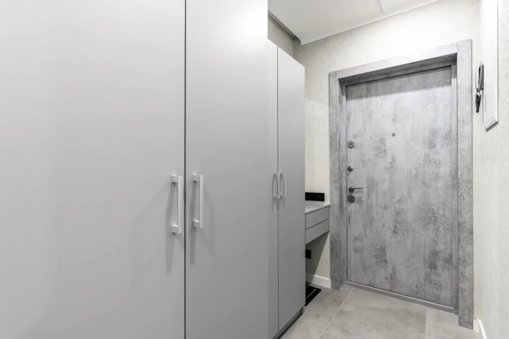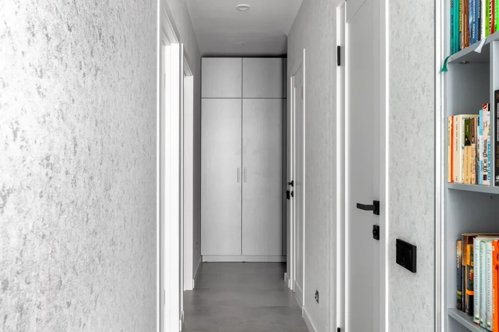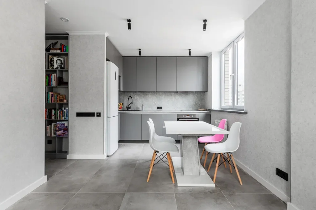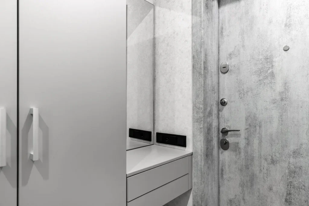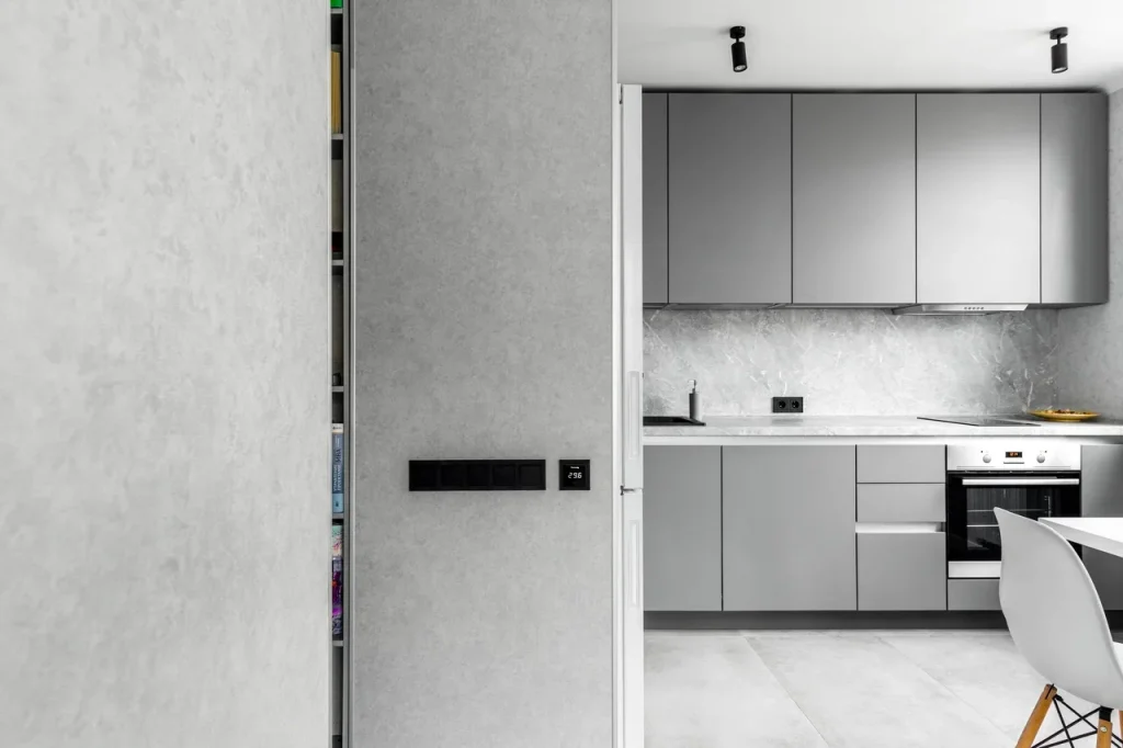 Ремонт двухкомнатной квартиры с меблировкой и изготовлением мебели от Domeo, для семейной пары с ребенком 3-х лет, с интерьером, выполненным в серых тонах, с прихожей, кухней-гостиной, мастер-спальней, детской комнатой и двумя санузлами