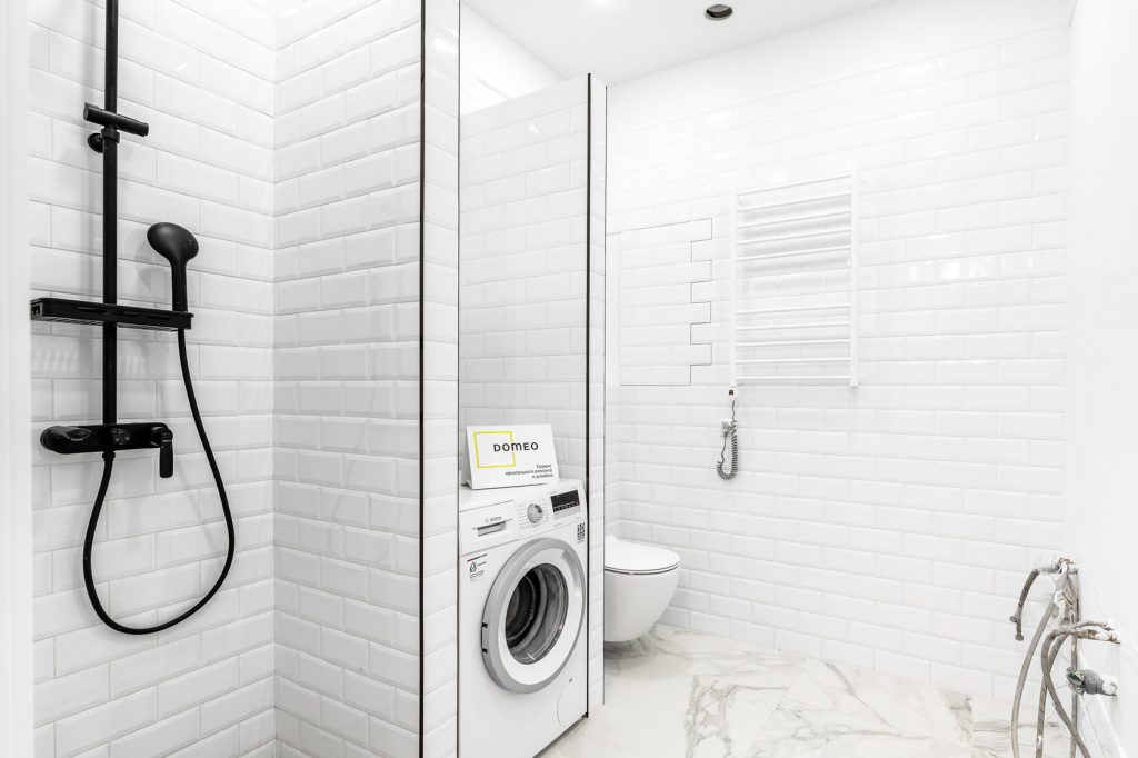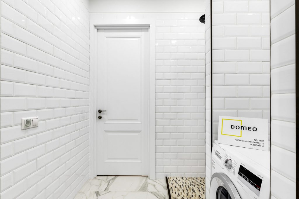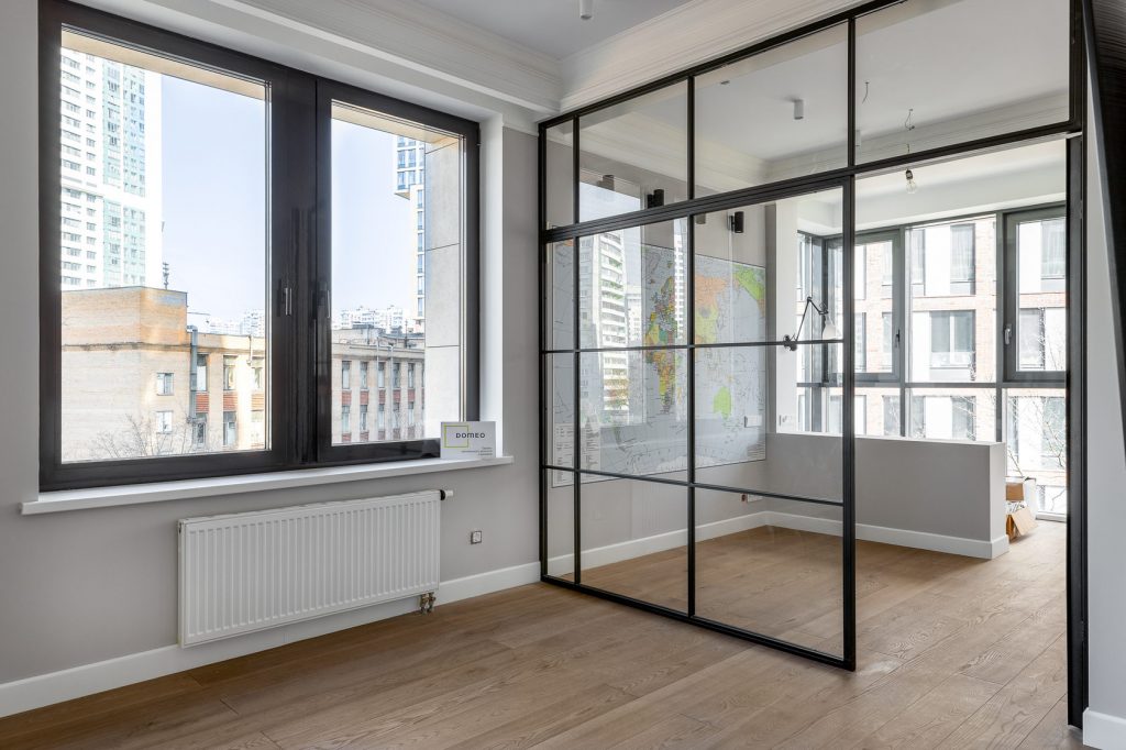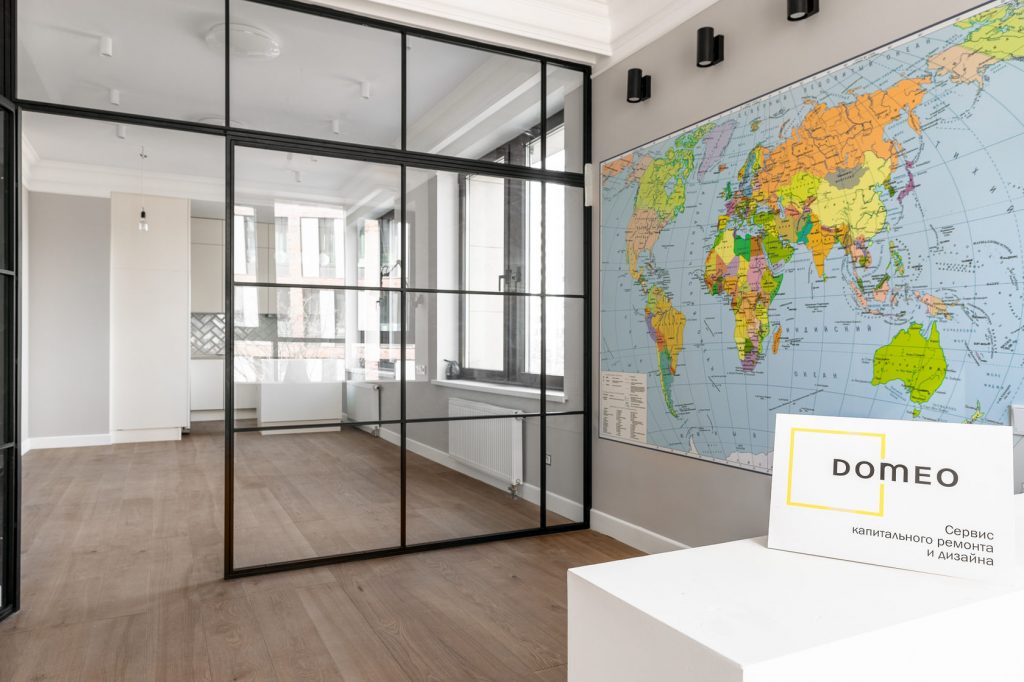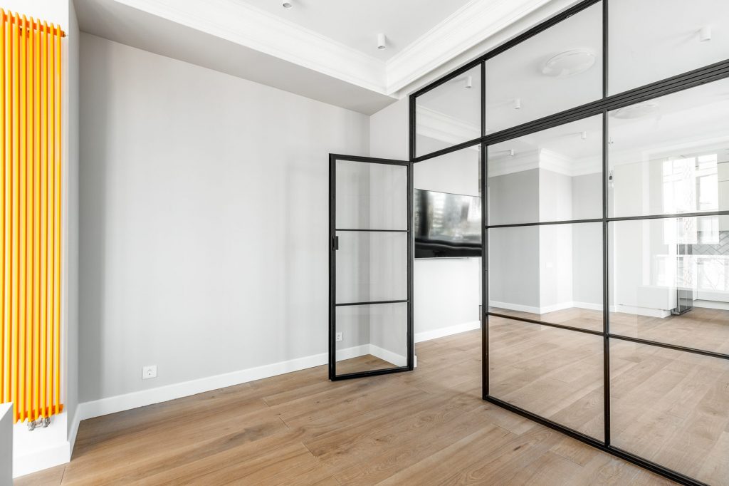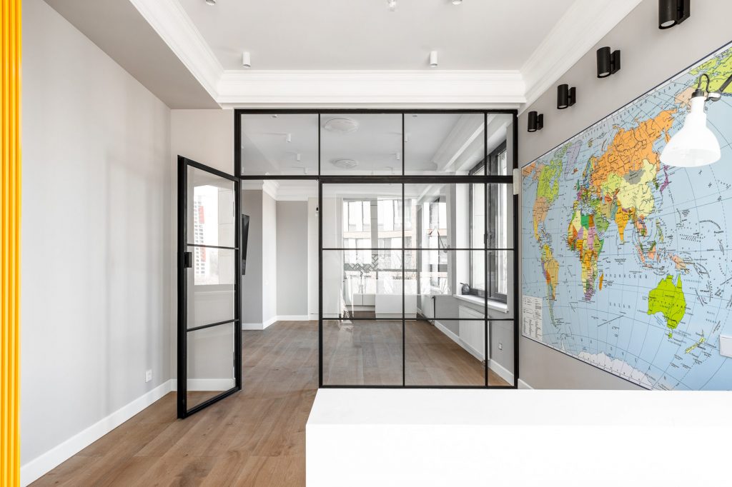 Ремонт трехкомнатной квартиры со стеклянной перегородкой, придающей пространству объем, с прихожей, кухней, гостиной, спальней, детской комнатой и двумя санузлами