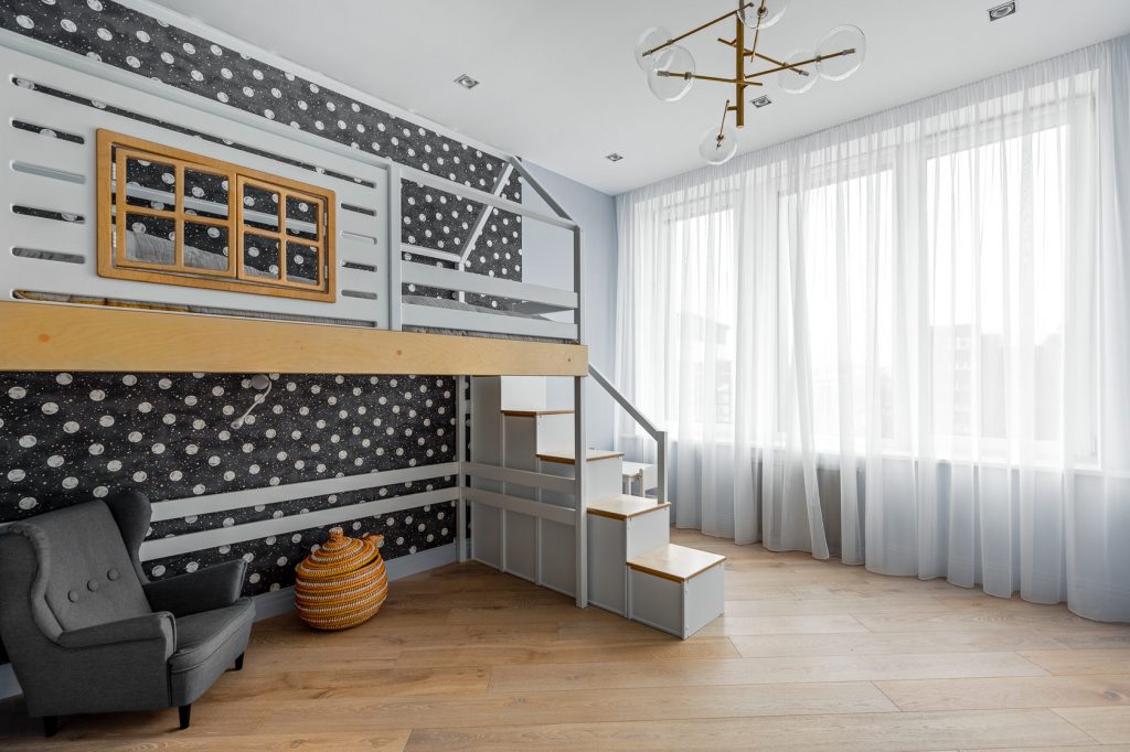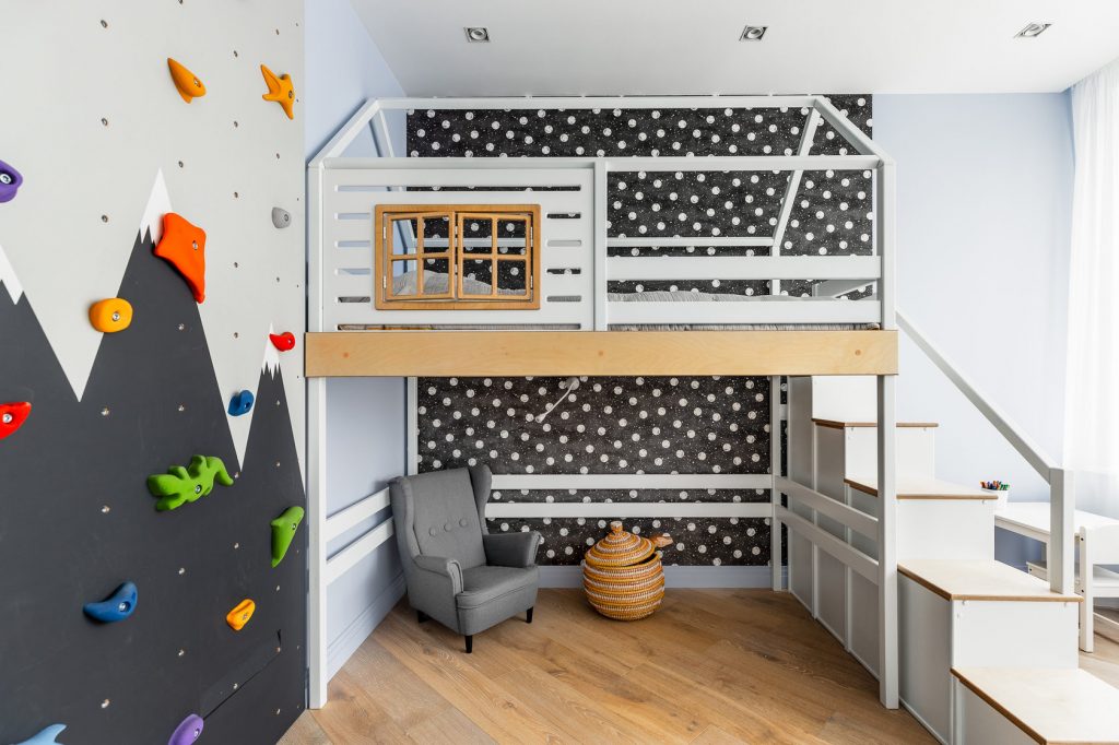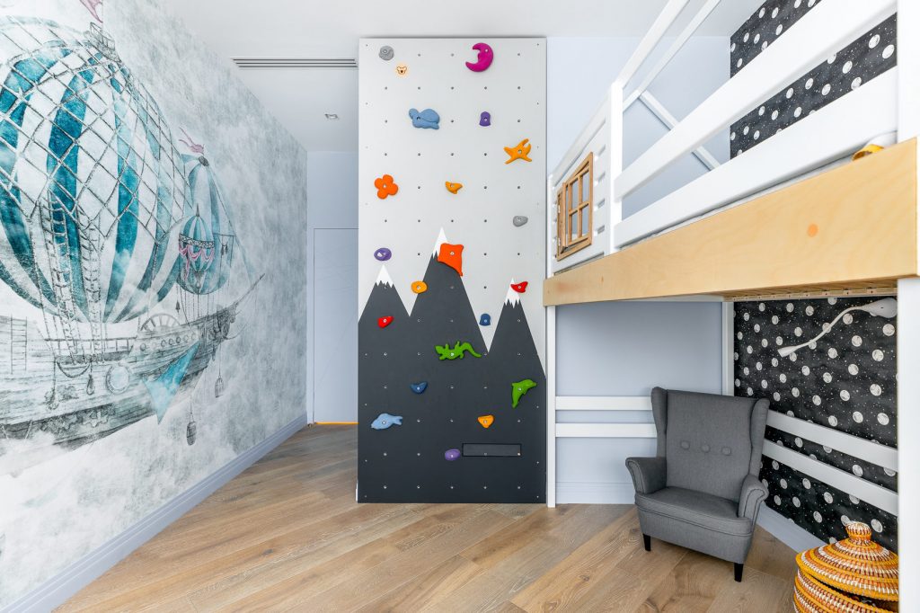 Комнату для мальчика мы оформили ярко и стильно, но минималистично, как и хотела заказчица: кровать на втором ярусе освободила пространство, стена-скалодром выполняет и декодирующую, и практическую функции.