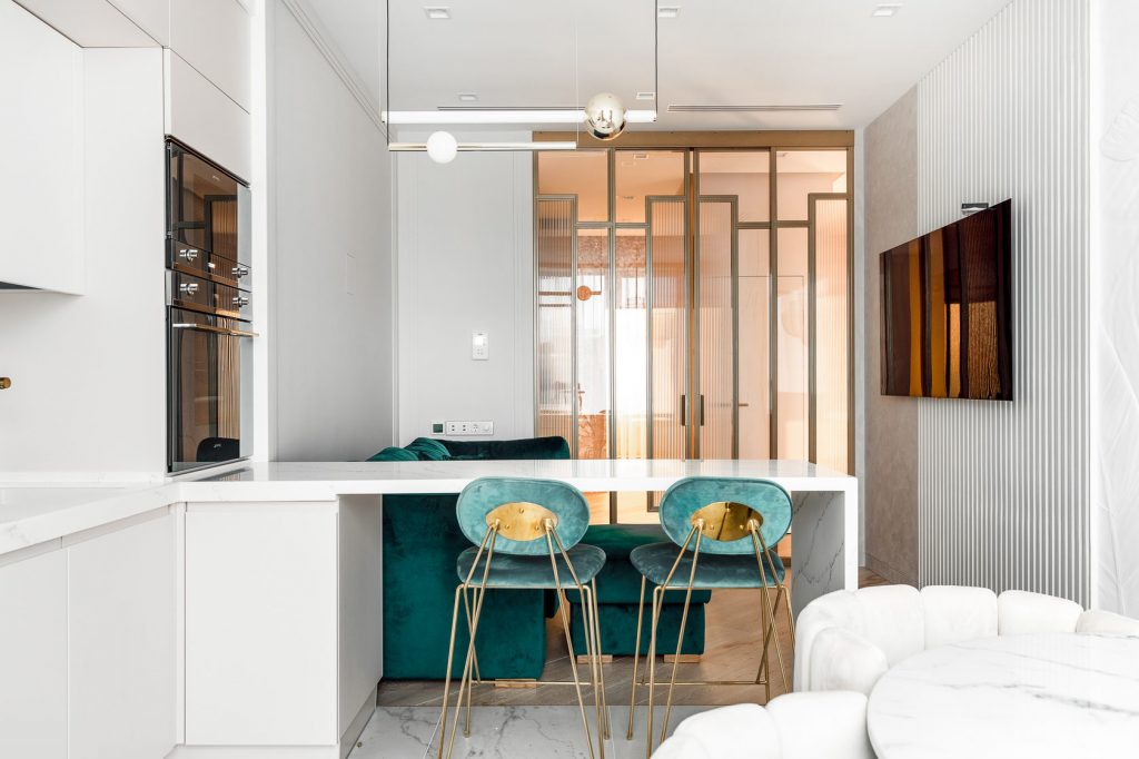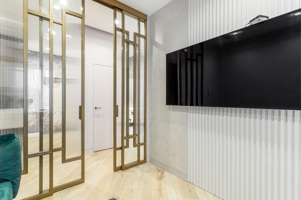 Стеклянные перегородки стали отличным решением для визуального расширения пространства и большего количества света в кухне-гостиной. Такие же перегородки мы использовали и в оформлении небольшого кабинета: ими мы отделили лоджию, при этом увеличив ее площадь, и организовали рабочее место — комфортное, стильное и светлое. Муж с удовольствием работает в новом кабинете, несмотря на то, что оформлялось пространство без его участия.
