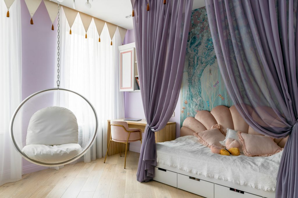 Атмосферу волшебства и уюта в комнате девочки удалось создать за счет органичного сочетания множества деталей — цветовых и отделочных решений, декора и аксессуаров.