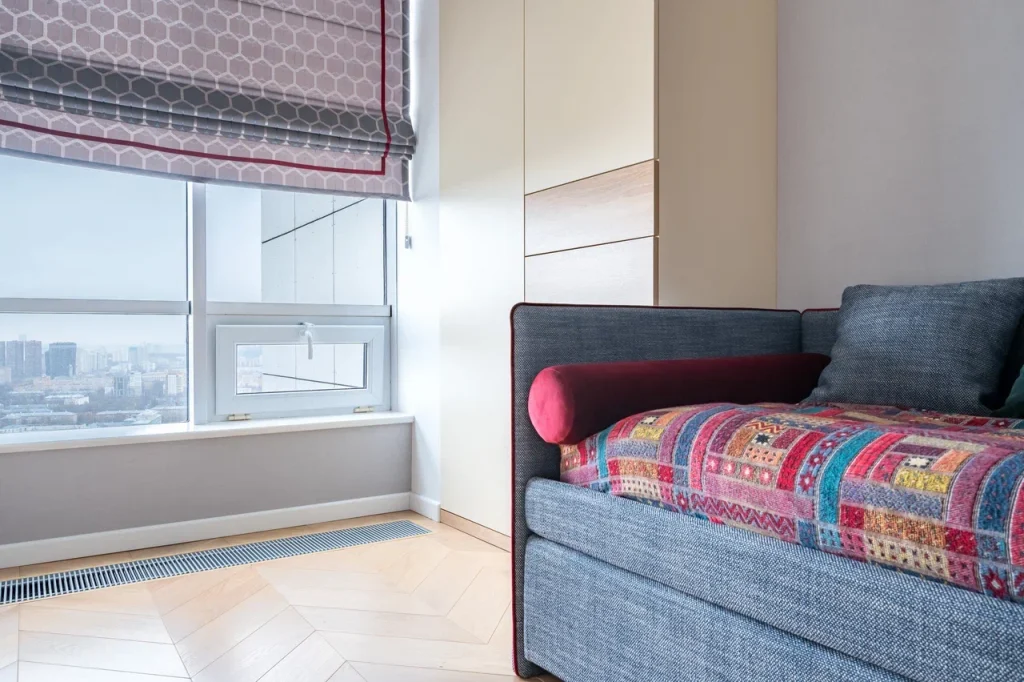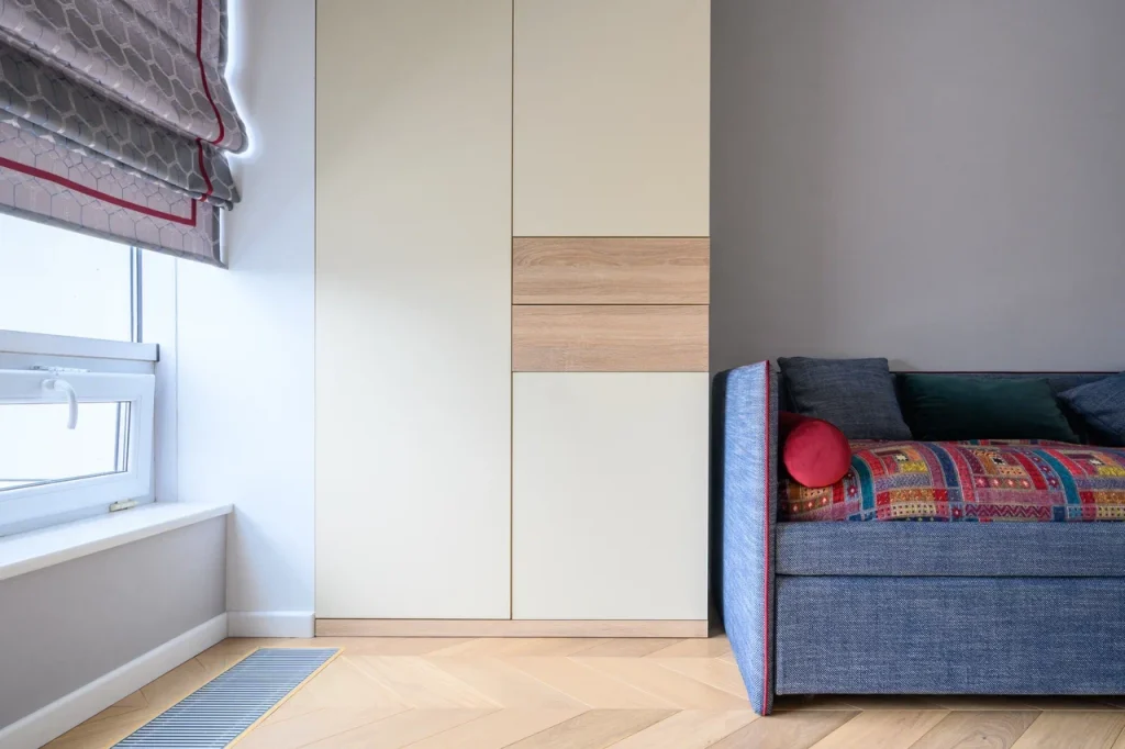 Ремонт стильной четырехкомнатной квартиры с меблировкой и изготовлением мебели от Domeo, для семьи с двумя детьми, с интерьером в светлых тонах с добавлением ярких элементов, с прихожей, кухней, гостиной, мастер-спальней, двумя детскими комнатами и санузлом