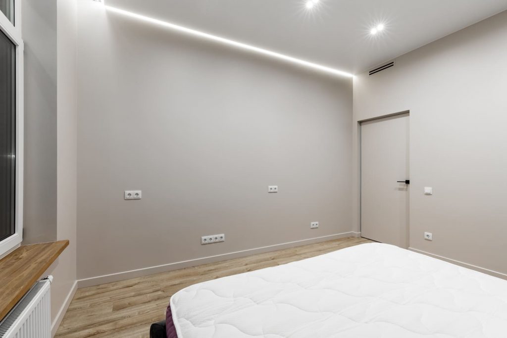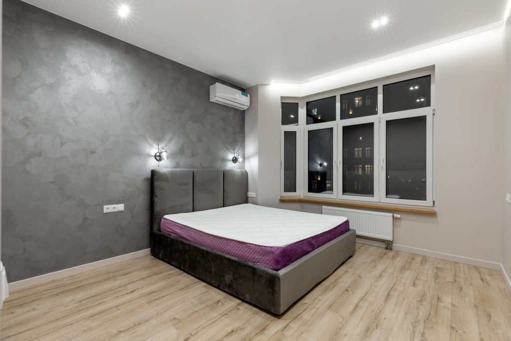 В главной спальне было принято решение также использовать декоративную штукатурку в качестве отделки акцентной стены. Напротив кровати на стене проведено много розеток - по индивидуальным меркам хозяева квартиры ждут интерьерную стенку с местом под телевизор, акустическую систему и аквариум.