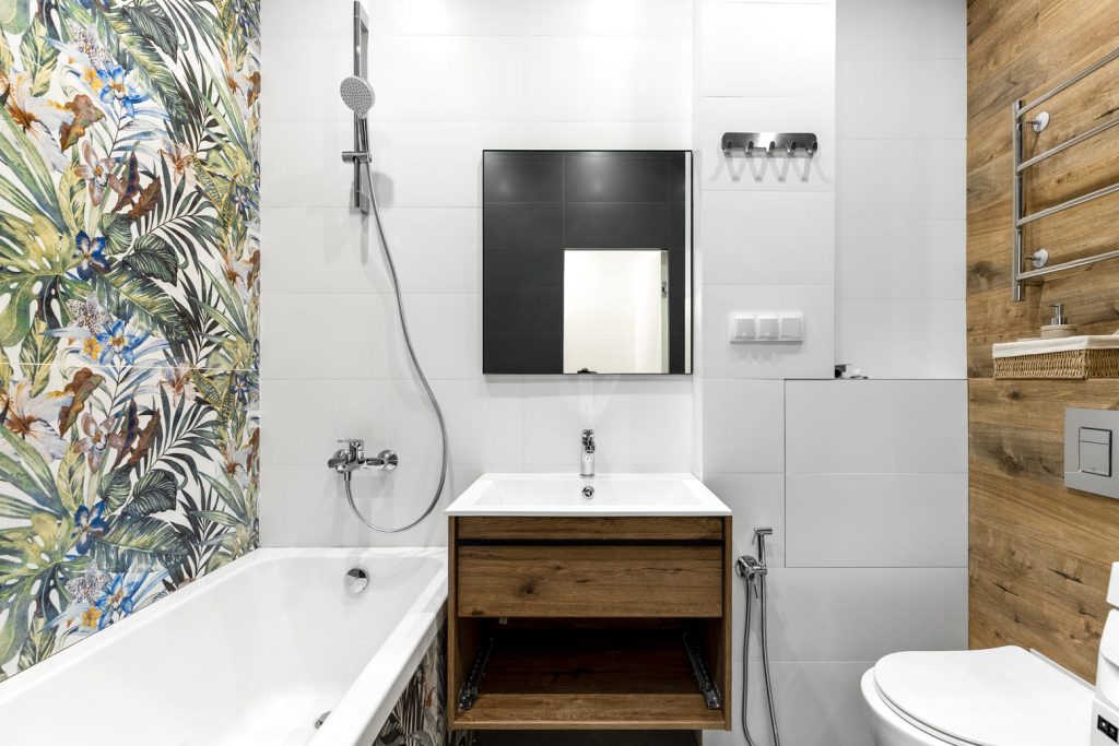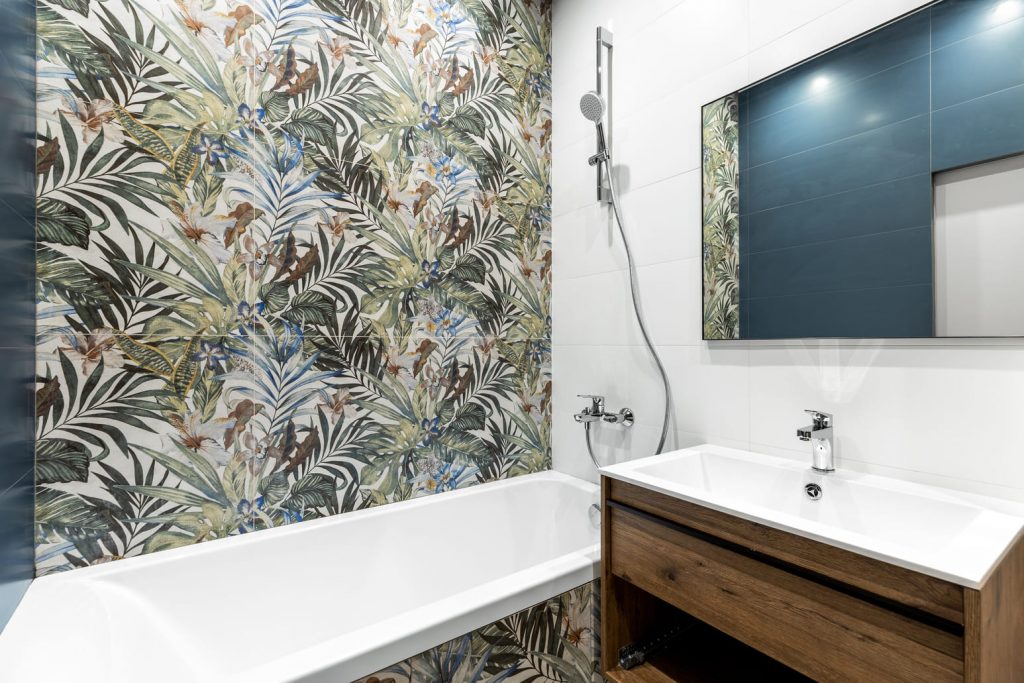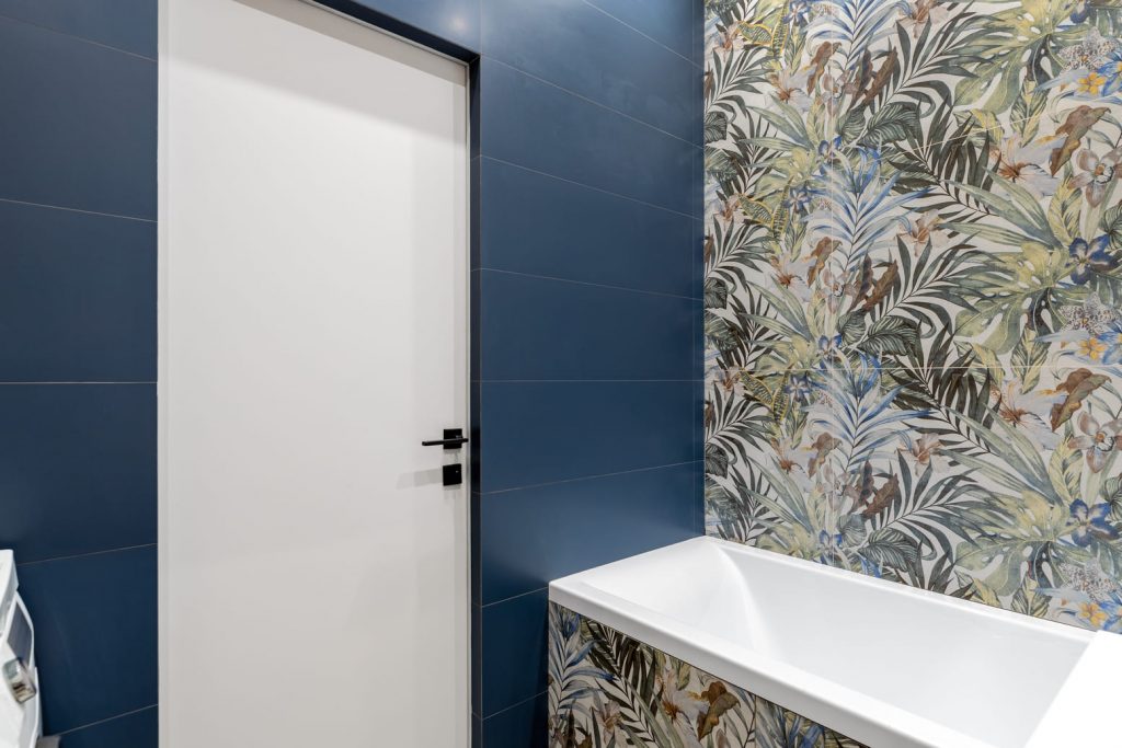 В ванной по проекту плитка уложена с определённым растительным орнаментом, составляя общую узорную картину на стене и самой ванной. Подвесная инсталляция унитаза скрыта за плиткой.