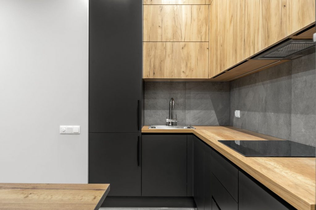 Кухонная зона по дизайн-проекту сделана в тёмных оттенках, со встроенной в ящики вентиляцией, посудомоечной машиной и холодильником. Проведено достаточно розеток и есть своя подсветка.