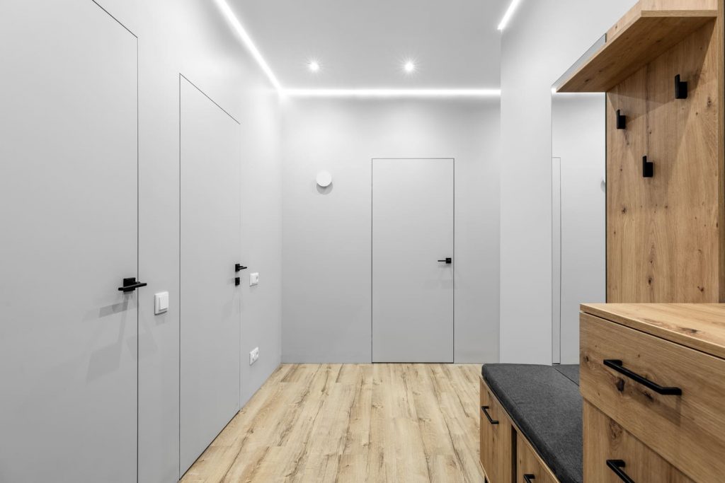 При входе в квартиру гостей встречает светлое пространство — много встроенного света и светлые стены визуально увеличивают помещение, а подсветка по периметру поднимает потолок, делая его «воздушным».