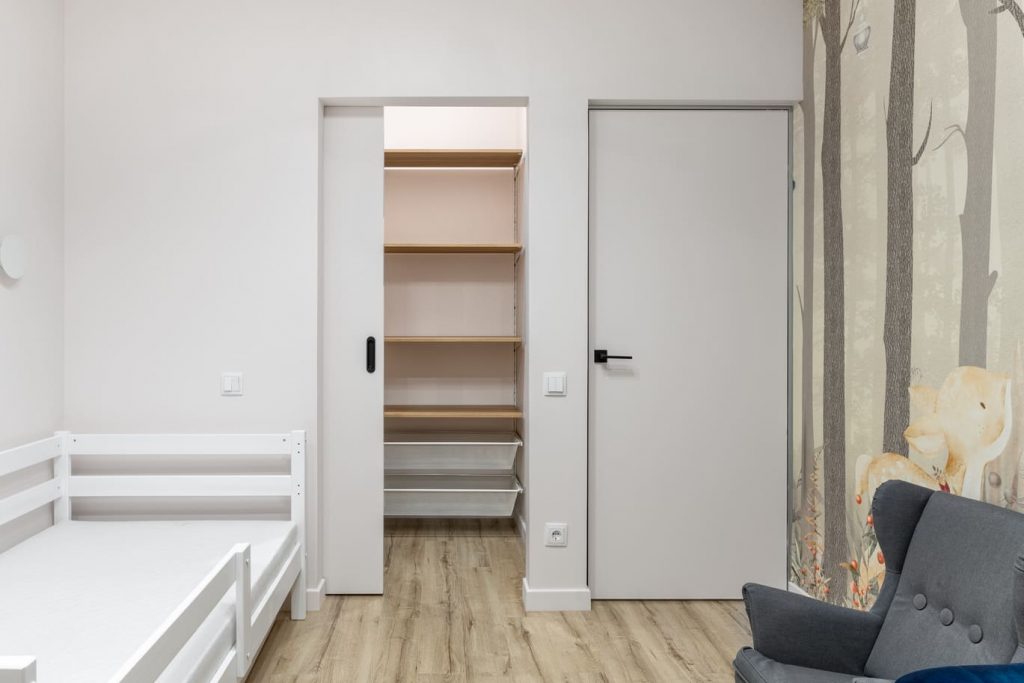 С помощью 3D печати в детской комнате нанесена художественная роспись, стены идеально ровно окрашены, а в гардеробной предусмотрена выдвижная дверь.