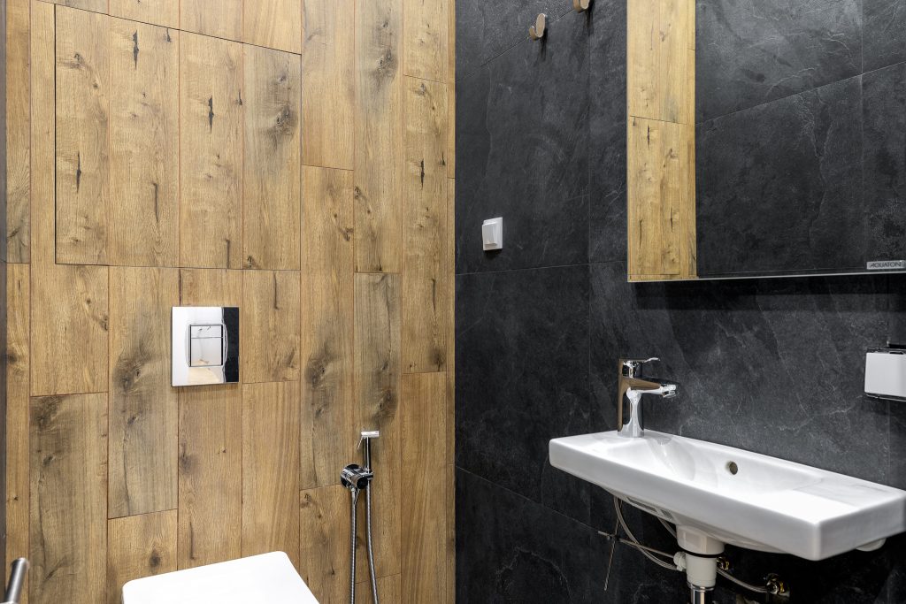В гостевом санузле использовались 2 материала, сочетание которых создает настоящий уют — дерево и черный керамогранит,
