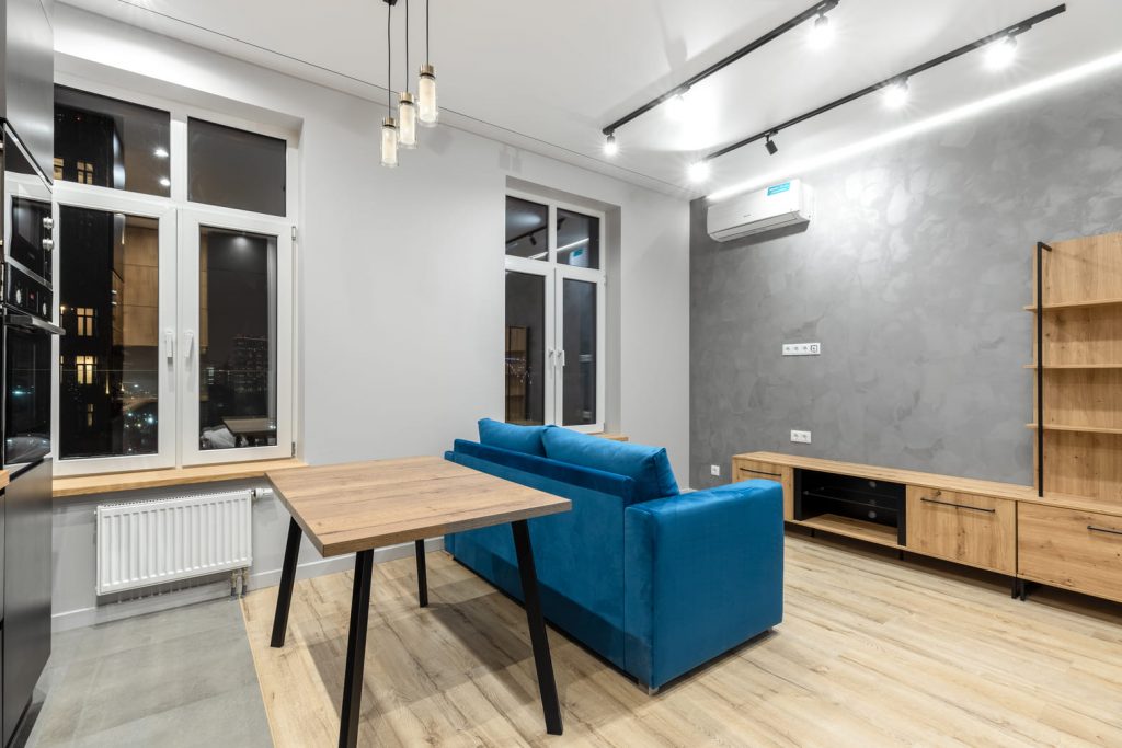 Квартира в современном стиле в спокойных тонах с синими акцентами